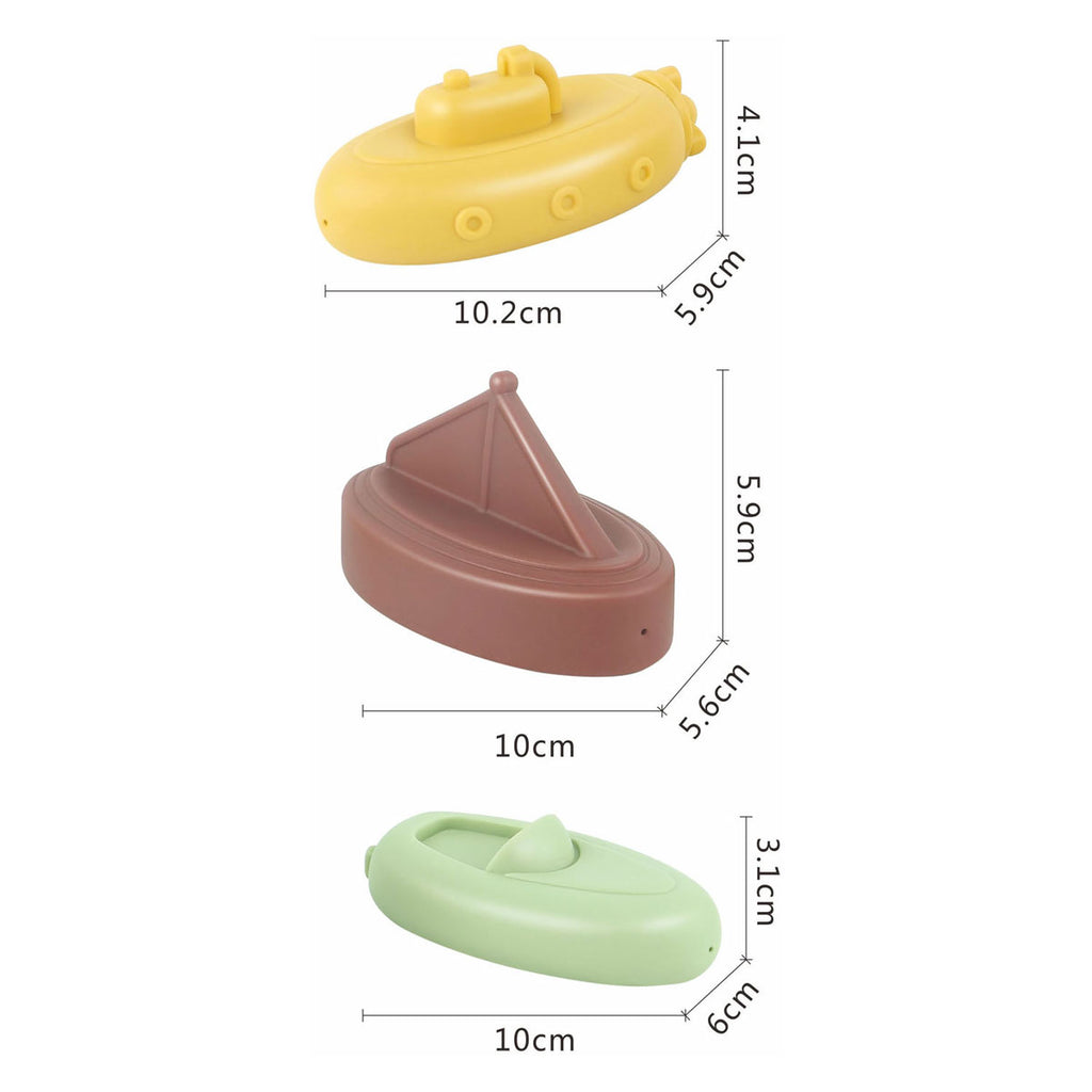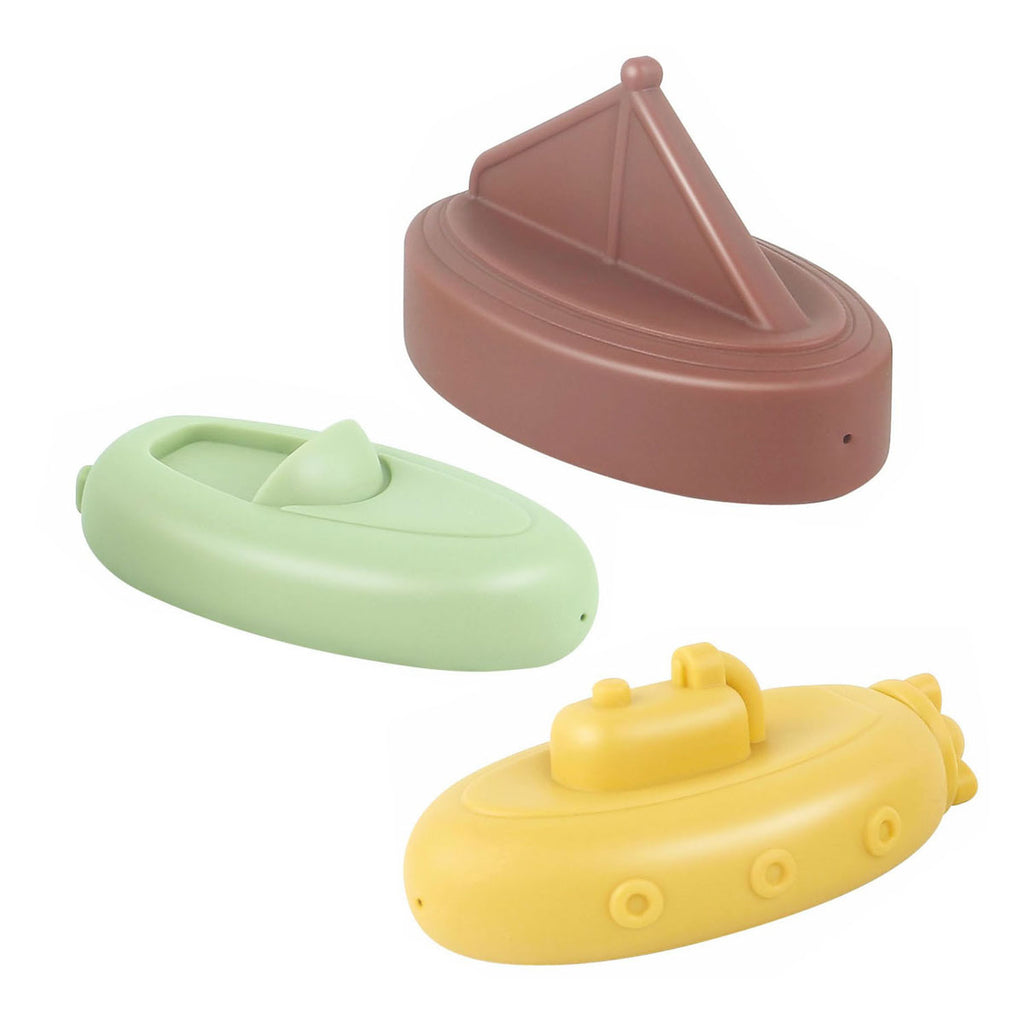 Drie stuks vaartuigen voor in bad, namelijk een gele onderzeeër, bruine zeilboot en groene speedboot. De bootjes zijn ongeveer 10 bij 6 bij 3,5 centimeter groot (verschilt enigszins per bootje). Geschikt voor kinderen vanaf 3 jaar oud.