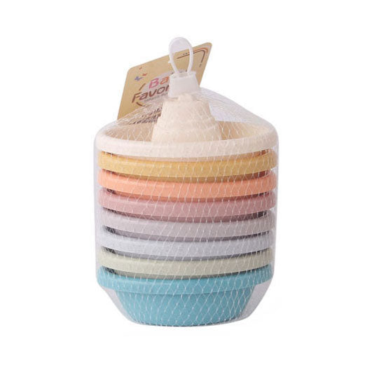 Set van 8 kunststof badbootjes in zachte pastelkleuren. Afmetingen: ca. 11 x 3,5 centimeter. Geschikt voor kinderen vanaf 6 maanden oud.