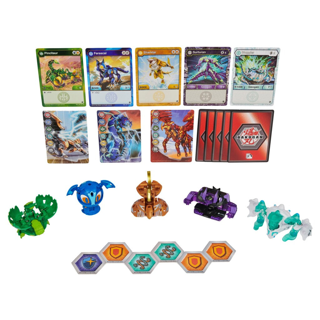 Inhoud: 2 exclusieve Bakugan Geogan, 3 Bakugan, 6 Bakukernen, 3 personagekaarten, 7 bekwaamheidskaarten, 3 poortkaarten en een vel met regels voor Bakugan-gevechten. Assorti. Geschikt voor kinderen vanaf 6 jaar.