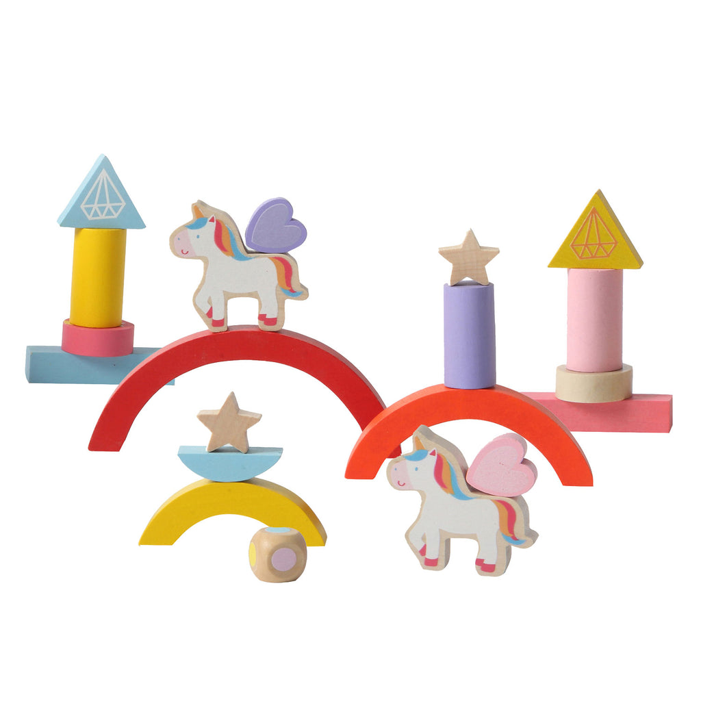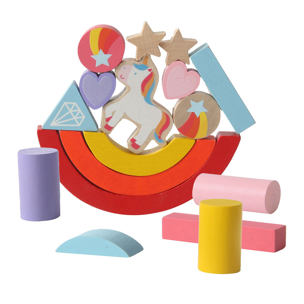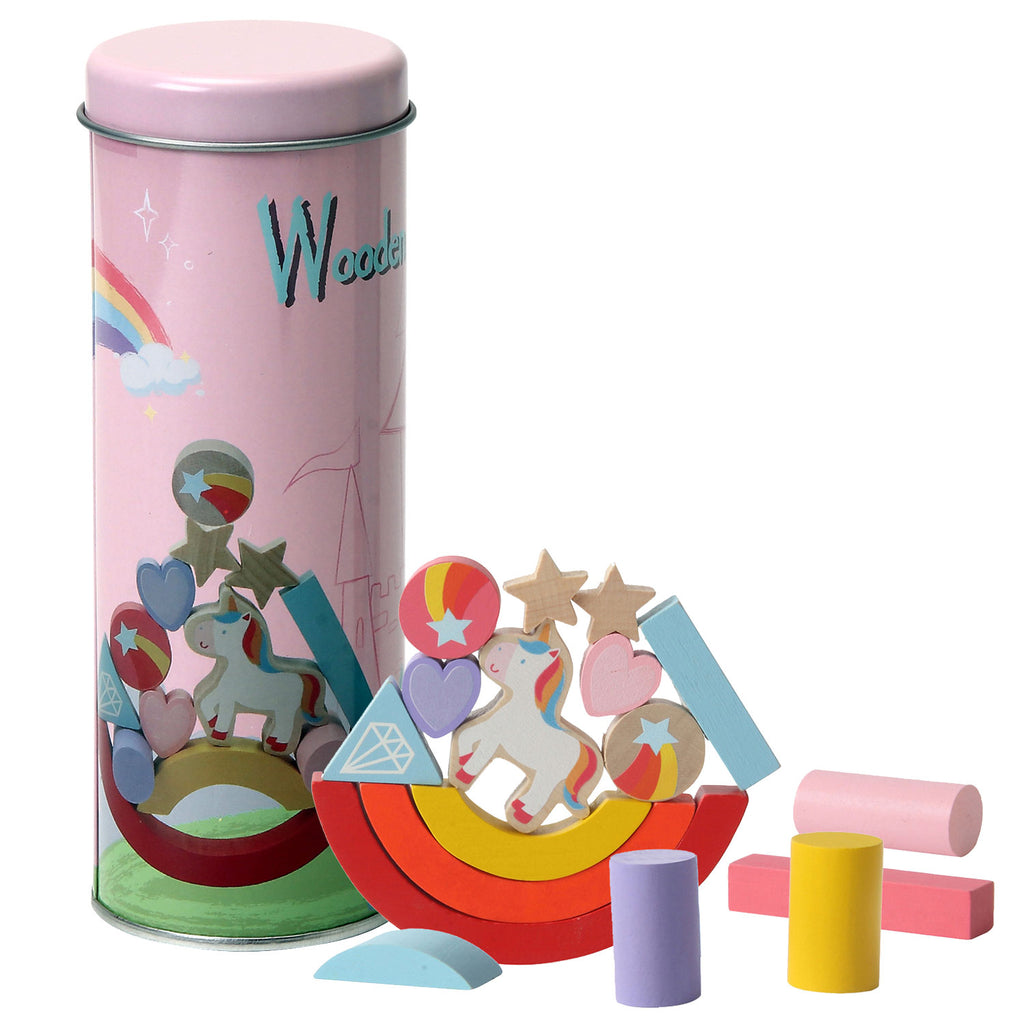 Blik vol met houten vormen, waaronder eenhoorns, waar je een balansspel mee kan spelen.