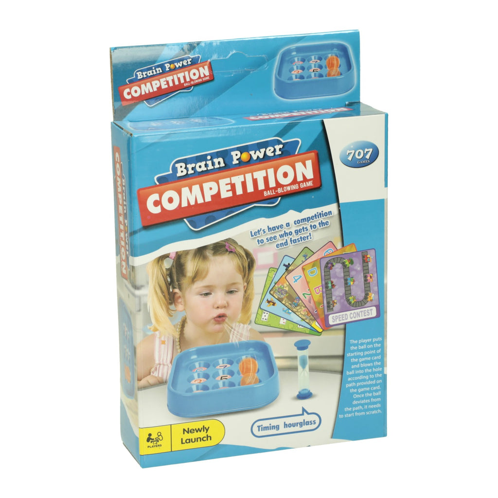 Wie blaast de ballen over de juiste route naar de eindstreep toe? Kies een van de kaartjes uit waar de route op afgebeeld staat en schuif deze in de baan. Blaas het balletje nu zoals op het kaartje aangegeven staat naar de finish toe. Bij de set zitten meerdere kaartjes met routes, een balletje, een houder en een zandloper. Geschikt voor 2 tot 4 personen en geschikt voor kinderen vanaf 3 jaar.