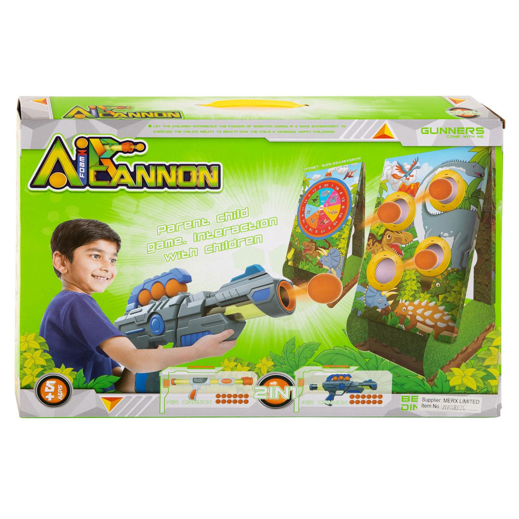 Ballenschieter Dino met Target. In de set zitten twee air cannons, 8 foam balletjes en een dubbelzijdig, kartonnen target. LET OP! de foto's op de verpakking wijken af van de speelgoedpistolen die in de set zitten. Set wordt geleverd zoals te zien is op afbeelding 3.