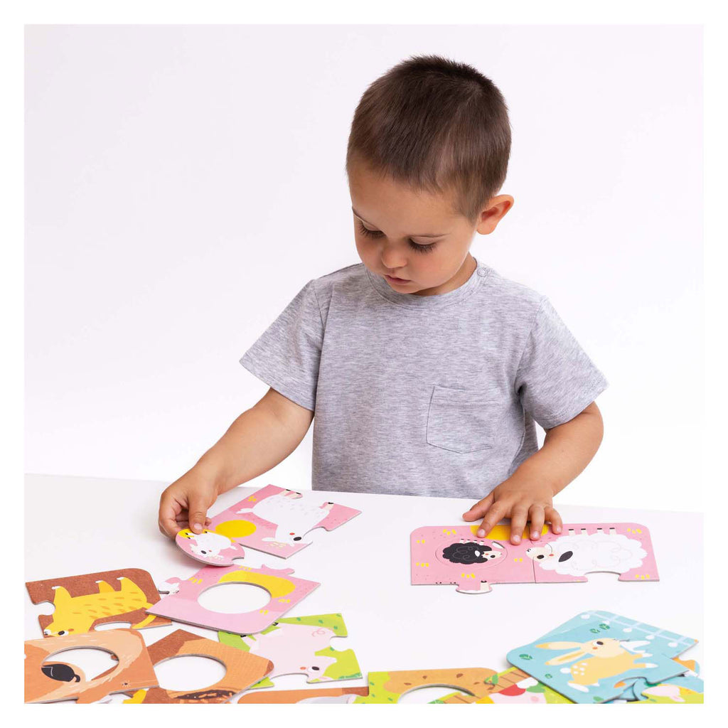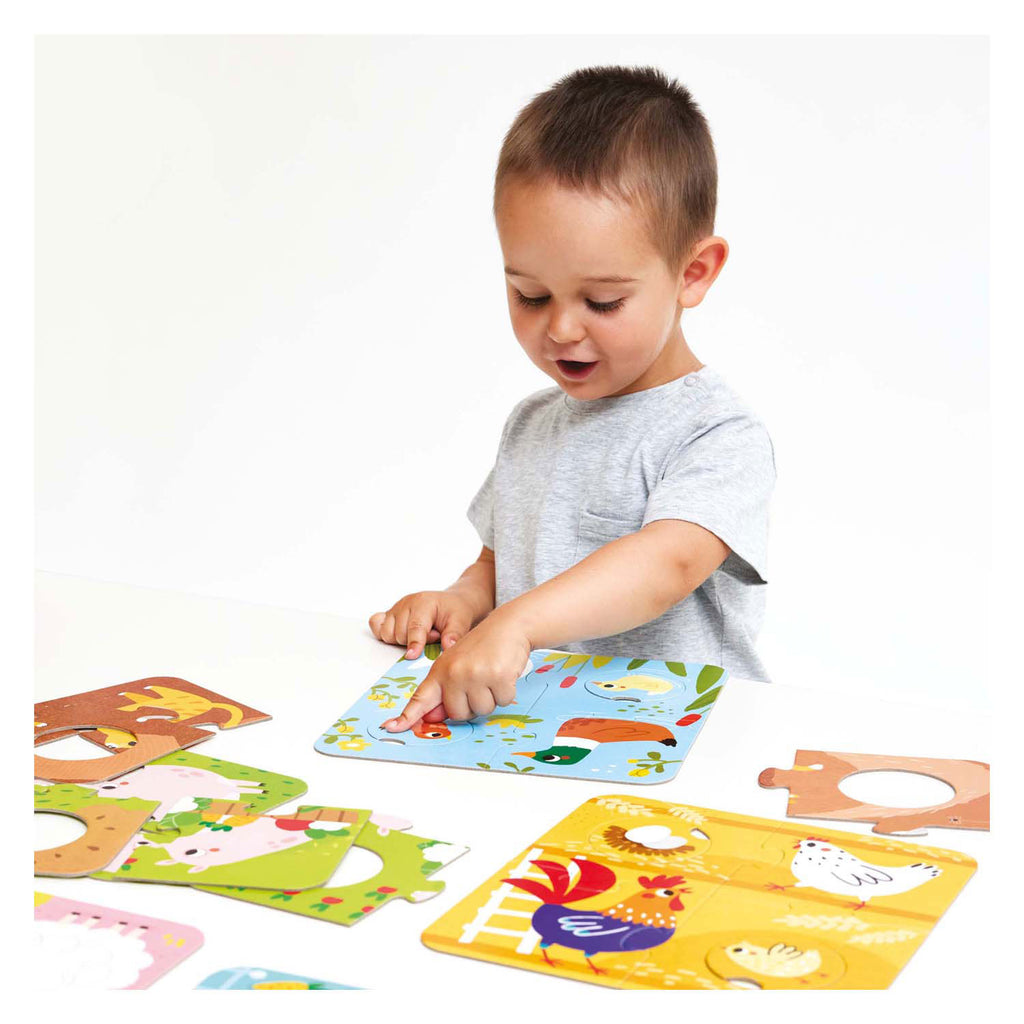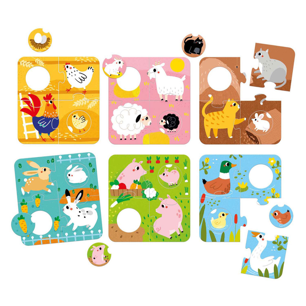 Elke puzzel is voorzien van levendige illustraties van schattige boerderijdieren, waardoor peuters van 1-3 jaar de puzzelstukjes gemakkelijk kunnen vastpakken en verbinden. Het grote formaat van de stukjes is perfect voor kleine handjes, wat zorgt voor urenlang speelplezier en leren zonder frustraties.