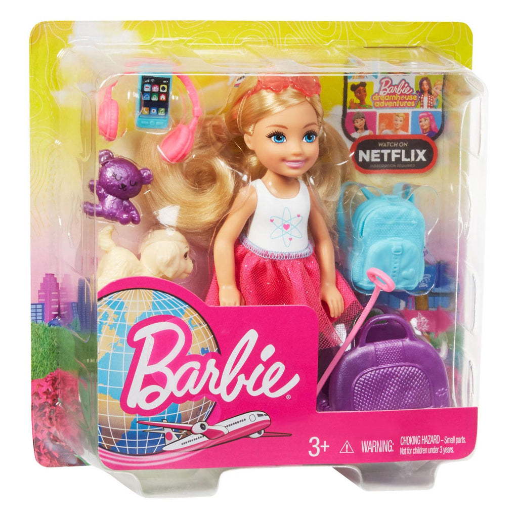Barbie reisplezier Chelsea pop met hond en accessoires. Geschikt voor kinderen vanaf 3 jaar.
