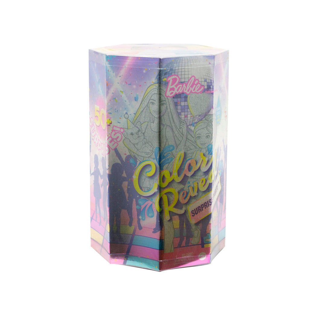 Deze Barbie ® Color Reveal ™ set levert de ultieme unboxing ervaringen met meer dan 50 verrassingen, waaronder een Barbie ® Color Reveal ™ pop en Kleur Reveal ™ Chelsea ™ pop in een zilverkleurige metalen bekleding met kleurrijke confetti sterren, plus twee Color Reveal ™ huisdieren in metallic roze en paars! Open de cadeauset om een ??dubbelzijdig uitpakspel en een speelmat met een dansfeestthema te vinden. Speel het spel om de 21 mysterieuze dozen uit te pakken met daarin verborgen verrassingen, zoals mode, haaraccessoires, feestversieringen en meer. Zodra de dozen zijn geopend, is het tijd om het onthullingsplezier te beginnen. Verwijder deBarbie ®Color Reveal™-pop uit de tube, vul de tube met warm water, plaats de pop erin en draai haar rond. Het water verandert in een metallic zilverachtige kleur met glinsterende wervelingen, en wanneer de pop wordt uitgetrokken, worden haar gelaatstrekken onthuld! Herhaal het proces met Chelsea™-pop en de huisdierenvrienden. En de verrassingen gaan door... dompel de spons in ijskoud water om de zes kleurveranderingsfuncties te activeren! De verpakking maakt ook deel uit van het plezier - gebruik de pakketstukken om een ??DJ-booth, feestartikelen en een puzzel te maken. Gebruik alle stukken met de speelmat om een ??dansvloer op te zetten waar Barbie®- en Chelsea™-poppen de hele nacht kunnen zingen en dansen! Welke poppen ga jij onthullen? Kinderen kunnen alle Color Reveal™-poppen verzamelen om accessoires te mixen en matchen en de mogelijkheden uit te breiden! Elk afzonderlijk verkrijgbaar, afhankelijk van beschikbaarheid. Poppen kunnen niet op zichzelf staan.