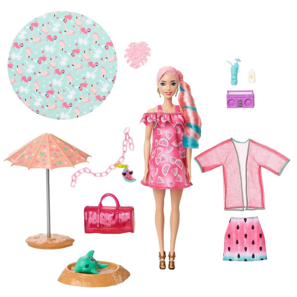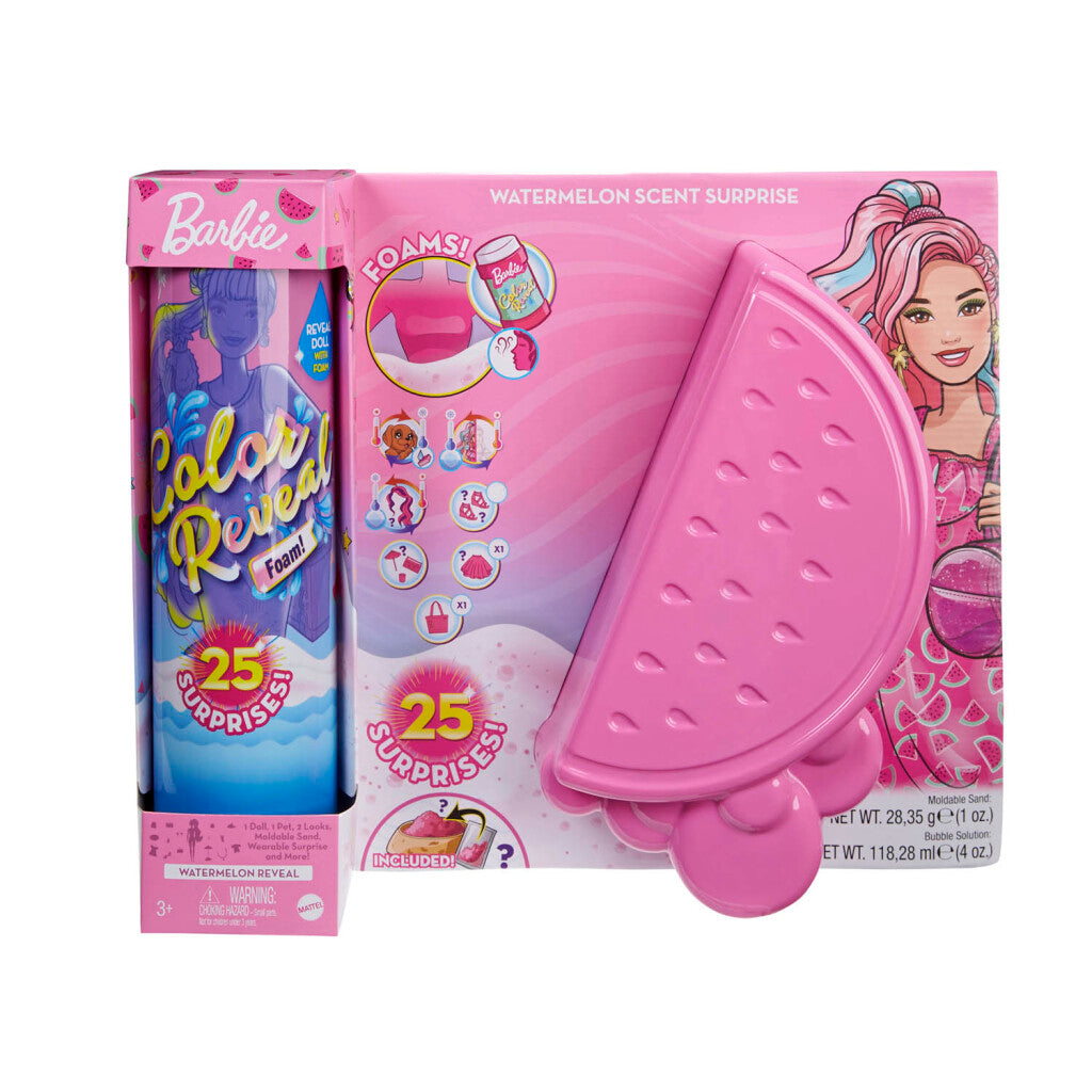 Pak wel 25 verrassingen uit met deze Barbie Color Reveal Ultimate Reveal Wave 3 Foam Watermeloen. Dompel de pop onder water en zie hoe ze van kleur verandert. Met de zeep kun je een heerlijk schuimbad maken. Het ruikt naar watermeloen! Ontdek ook een lief dierenvriendje, gave outfits, kinetisch zand en tal van leuke accessoires. Geschikt voor kinderen vanaf 3 jaar.