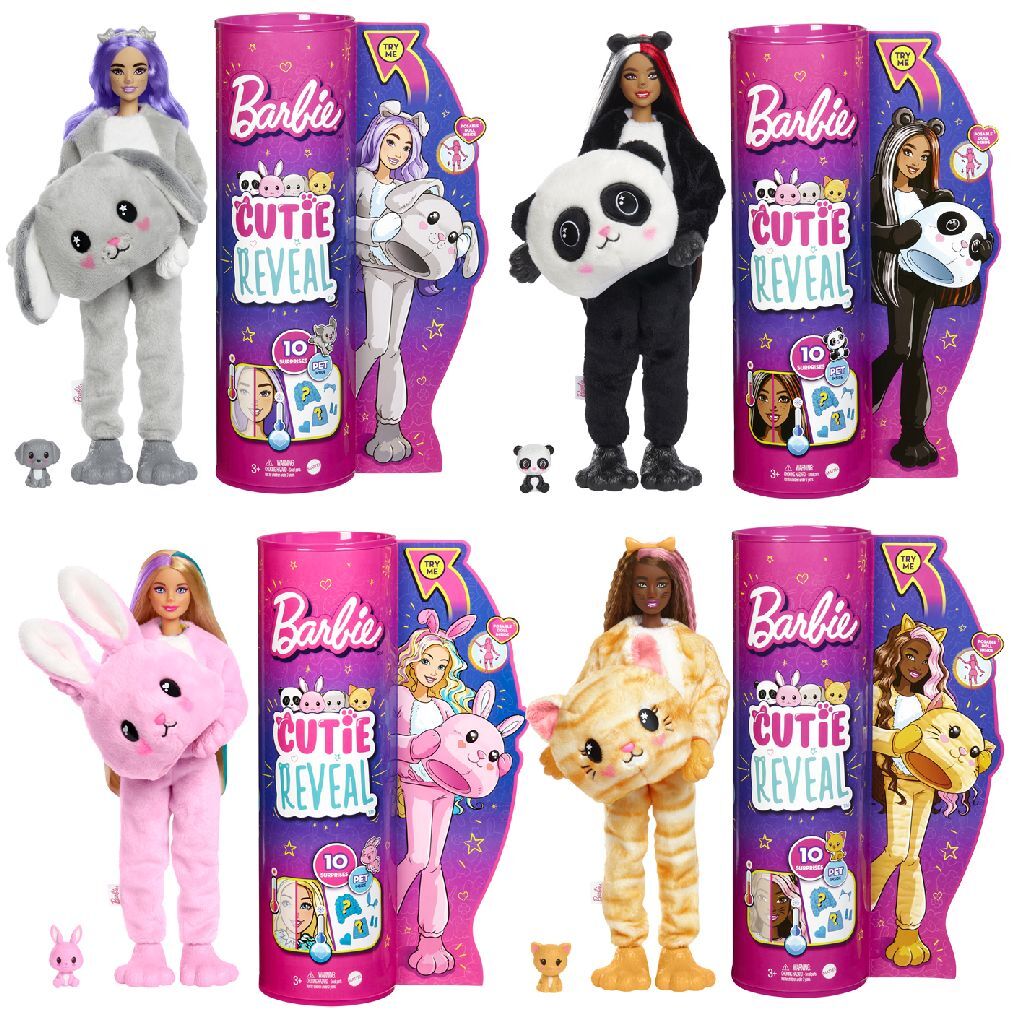 Met de Barbie Cutie Reveal poppen beleven kinderen een schattige uitpakervaring met 10 verrassingen! Pak de set uit en ontdek een zacht pluchen dier met een beweegbare Barbie pop en leuke accessoires waarmee je eindeloze transformaties kunt maken. Verkrijgbaar in meerdere uitvoeringen. U kunt niet kiezen, maar ontvangt een willekeurige uitvoering. Geschikt voor kinderen vanaf 3 jaar.