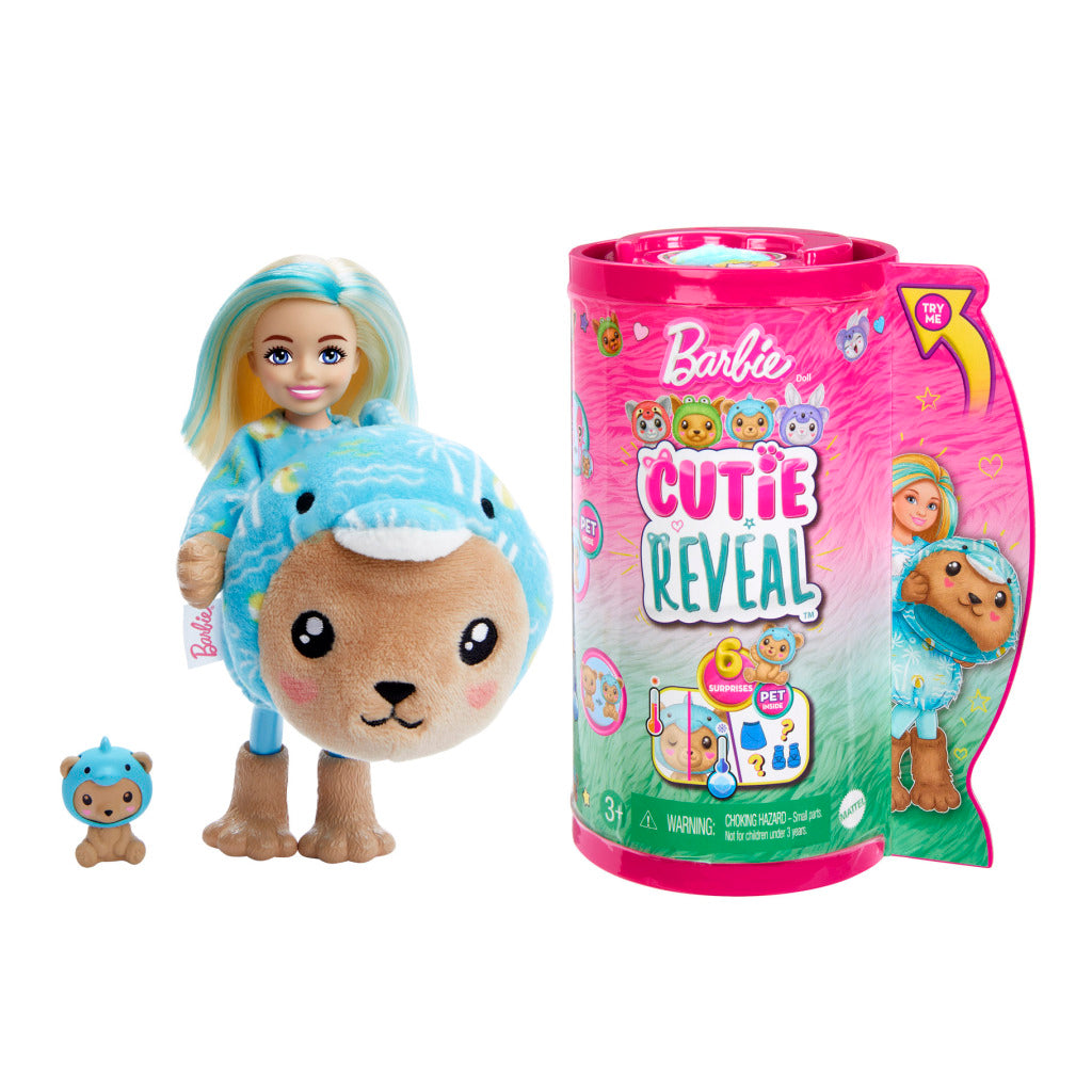 Met de Barbie Cutie Reveal Chelsea poppen uit de kostuumserie wordt uitpakken een belevenis met maar liefst zes verrassingen! Ontdek een kitten, verkleed als rode panda, een hond als kikker, een teddybeer als dolfijn of een konijn als koala. In het dierenpak zit een Chelsea pop verstopt. Welke pop heb jij? Maak het nog gezelliger en maak ook de andere verrassingen open! Wat dacht je van een rokje en een mini-diertje dat past bij het dierenpak van de pop? Keer de pluche top binnenstebuiten en je hebt een oversized jack; keer het hoofd van het pak om en er komt een dierenbedje tevoorschijn. Met ijskoud en warm water kun je het mini-diertje zo vaak als je wilt van kleur veranderen voor nog meer speelplezier! Kids vinden het heerlijk om alle verrassingen te ontdekken in deze snoezige Barbie Cutie Reveal serie. De poppen zijn per stuk verkrijgbaar en niet overal leverbaar. Poppen kunnen niet los staan. Afwijkende kleuren en versieringen mogelijk. Geschikt voor kinderen vanaf 3 jaar.