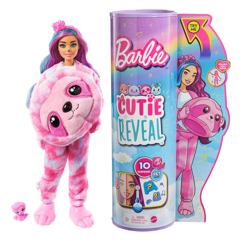 DeBarbie Cutie Reveal Dreamland Fantasy luiaard set bevat een Barbie in luiaardkostuum, een pluizig pluche luiaardvriendje en vier verrassingszakjes met accessoires. Het bovenste deel van het kostuum verandert in een fleecejack, terwijl het hoofd van het kostuum een ??kinderbedje wordt. Geschikt voor kinderen vanaf 3 jaar en ouder.