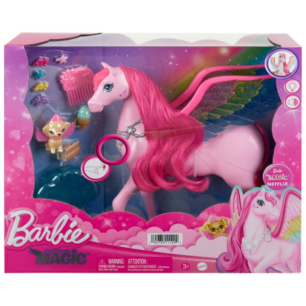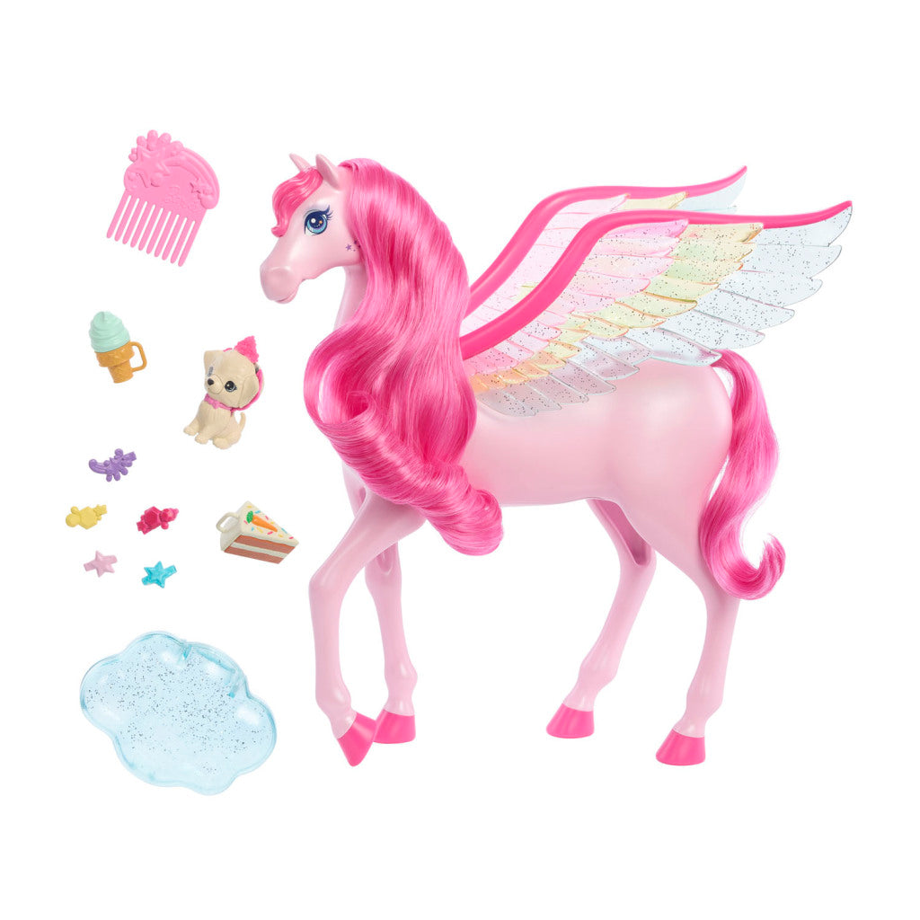 - Barbie Pegasus heeft felroze manen, een felroze staart en glanzende regenboogvleugels! Licht en geluid kun je op drie verschillende manieren activeren.