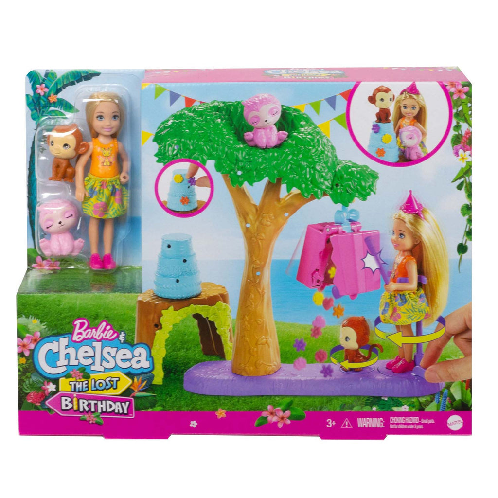 Vier Chelsea?s verjaardag met Barbie Chelsea?s Verjaardagsfeestje. Draai aan de hendel zodat Chelsea de piñata kapot kan slaan met de stok. Er komen versieringen uit waarmee de boom en taart versierd kunnen worden. Inclusief aap en luiaard. Geschikt voor kinderen vanaf 3 jaar.