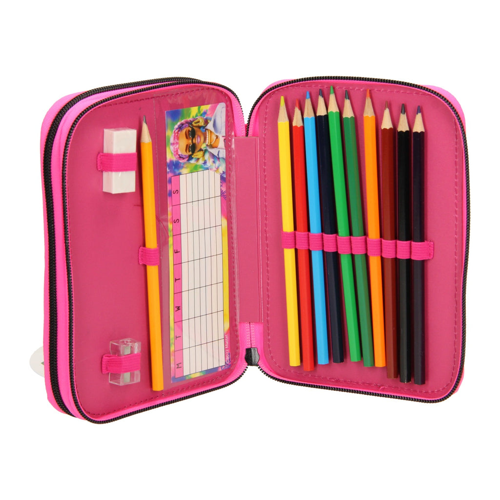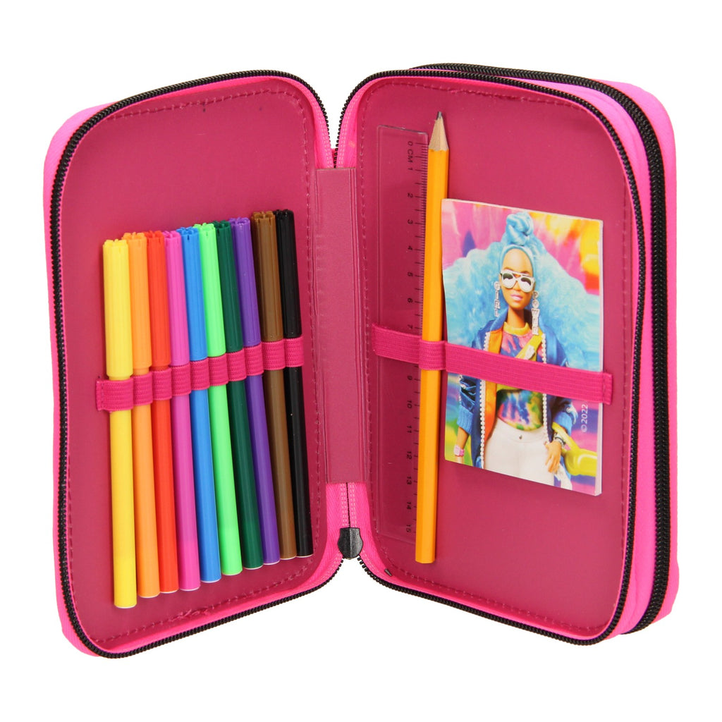 Gevuld etui met Barbie voorop. Gevuld met 26 schrijfwaren. Formaat: 15 x 21 x 5 cm groot. Adviesleeftijd: 6 jaar en ouder.