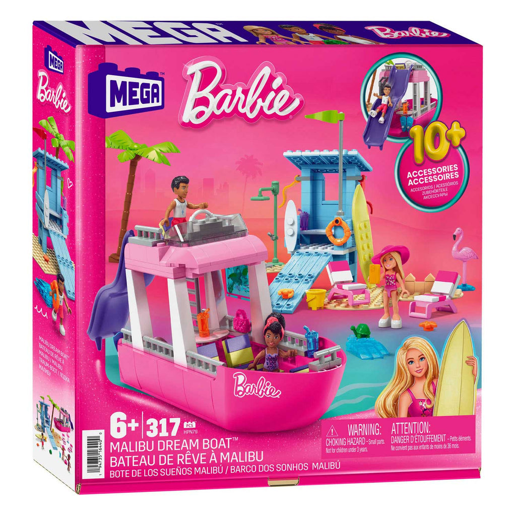 Kids kunnen samen met Barbie en haar vrienden naar het strand om spetterende avonturen te beleven met de Malibu Droomboot. De bouwset van de droomboot bevat ligstoelen, een tv, een zitgedeelte, een glijbaan en een zonnedek. De bovenkant van de boot kan er gemakkelijk af, zodat kids ook binnen in de boot kunnen spelen. Ook de toren van de Malibu Strandwacht met een buitendouche en een paddleboard wacht op vaardige bouwers.