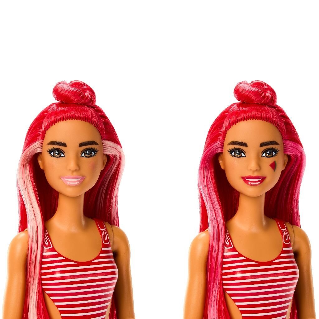 Barbie Pop Reveal poppen maken van uitpakken een feest met acht zintuiglijke verrassingen! Welke pop heb jij? Maak de verpakking die is geïnspireerd op een drinkbeker open en ontdek een van de vier smaken uit de serie Fruit: aardbeienlimonade, vruchtenbowl, watermeloensap of druivenprik. Open het deksel en haal de verrassingszakjes eruit, haal de bovenkant eraf en kijk hoe kleurig slijm over de ijsblokjes druppelt waarin de accessoires zich bevinden. Kids kunnen het zachte slijm eruit halen voor leuk zintuiglijk spel. Plop de ijsblokjes open om rolschaatsen en een zacht minidrankje te vinden. Je kunt de ijsblokjes steeds weer opnieuw gebruiken! Kids blijven uitpakken! Een pop die naar fruit ruikt, een zacht, lekker ruikend dierenvriendje, een outfit en accessoires. Elke Pop Reveal Barbie pop is beweegbaar en heeft van kleur veranderend haar en make-up. Kinderen willen ze allemaal verzamelen! De poppen zijn per stuk verkrijgbaar en niet overal leverbaar. Poppen kunnen niet los staan. Kleuren en versieringen kunnen variëren.