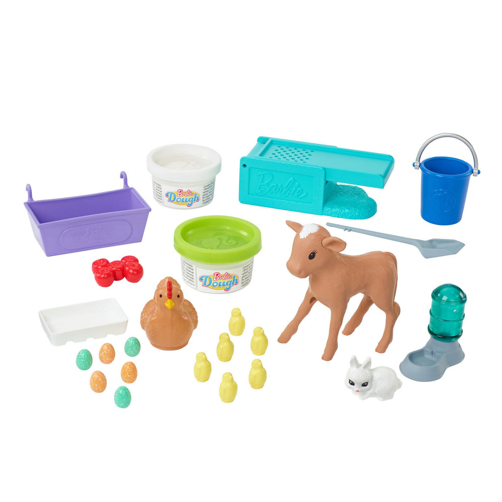 Bevat een Barbie pop in fleurige jurkje, 2 kippen, een aantal kuikens, een baby geitje en een baby konijntje, evenals verschillende accessoires. Geschikt voor kinderen vanaf 4 jaar.