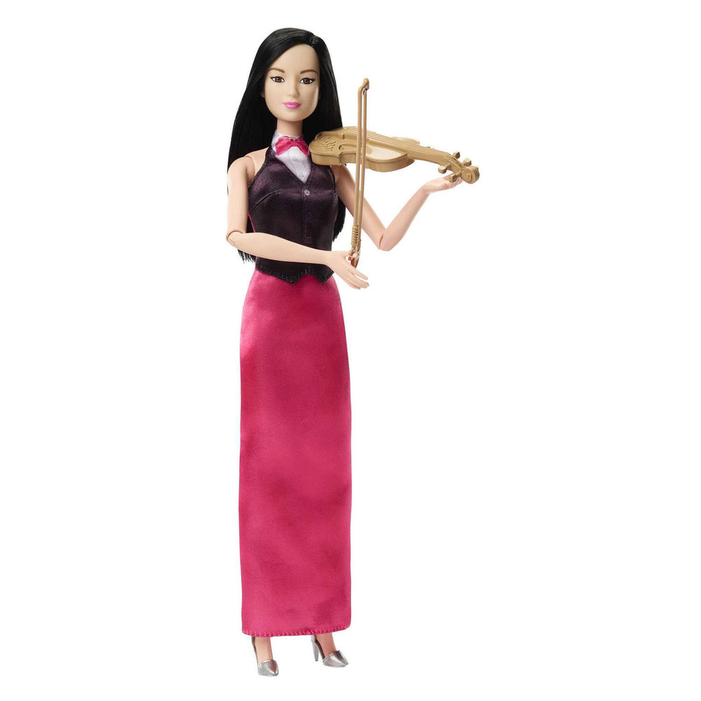 Deze magnifieke musicus met viool en strijkstok staat klaar om de show te stelen in haar elegante jurk met smokingvestje. De Barbie pop heeft beweegbare schouders en ellebogen, zodat kinderen haar echt kunnen helpen om 'viool te spelen'. Met Barbie beroepenpoppen kunnen kinderen grote dromen koesteren en fantaseren over alles wat ze later kunnen worden! Pop kan niet los staan. Kleuren en versieringen kunnen variren. Geschikt voor kinderen vanaf 3 jaar.