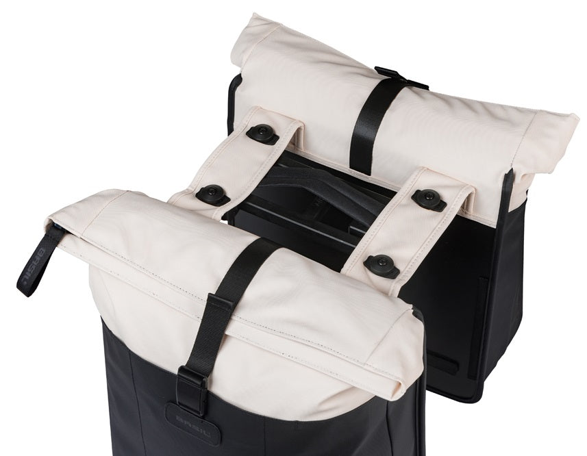 Ruimte en stijl voor al je dagelijkse ritten De Basil Vive dubbele fietstas combineert praktische inhoud met een moderne look. Of je nu de kinderen van school haalt, boodschappen doet of een weekendje weg gaat, deze dubbele fietstas biedt ruimte, gemak én uitstraling. De cleane kleurencombinatie van off-white met zwart zorgt voor een frisse, stedelijke look die bij iedere fiets past. Design & stijl Met zijn minimalistische vormgeving en zachte kleurcontrasten sluit de tas perfect aan bij de huidige urban lifestyle. De Basil Vive-serie staat bekend om subtiele details die zowel lichtheid als kracht uitstralen. Deze dubbele fietstas tilt je fietsrit naar een hoger niveau, zowel qua stijl als gebruiksgemak. Gebruiksgemak & functionaliteit Met een inhoud van 28 tot 35 liter biedt deze tas voldoende ruimte voor je dagelijkse spullen. De ruime hoofdvakken zijn waterdicht en afsluitbaar met een praktische vouwsluiting en gesp. Voorop zitten handige buitenvakken voor kleinere items. Dankzij slimme klittenbandsluitingen blijft de tas stabiel zitten, ook op hobbelige wegen. Techniek & bevestiging Je bevestigt de Basil Vive dubbele tas MIK eenvoudig dankzij de voorgemonteerde MIK-adapterplaat die voorzien is van een handige slotfunctie voor extra veiligheid. Wil je wisselen van fietsaccessoire, voor bijvoorbeeld een fietsmand, dan klik je je dubbele fietstas met gemak weer van de bagagedrager af. Heb je geen MIK bagagedrager op je (elektrische) fiets? Geen probleem. Monteer eenvoudig de MIK Carrierplate op je bagagedrager. Duurzaamheid & materiaalkeuze De Basil Vive dubbele tas is gemaakt van gerecycled PET-materiaal. Het waterdichte hoofdvak beschermt je spullen tegen elk type weer. Daarnaast is de tas volledig PFAS-vrij en voorzien van een handige repairzipper voor makkelijke reparatie, zodat je er nóg langer plezier van hebt. Kenmerken: Inhoud: 28 35 liter Afmetingen: 14 × 30 × 38 cm Gemaakt van gerecycled PET-materiaal Volledig PFAS-vrij Waterdichte hoofdvakken met vouwsluiting en gesp Handige buitenvakken voor kleinere spullen Bevestiging via voorgemonteerde MIK-adapterplaat Inclusief slotfunctie voor extra veiligheid Geschikt voor MIK bagagedragers en MIK Carrierplate Voorzien van repairzipper voor eenvoudige reparatie Kleur: wit/zwart Stabiele plaatsing dankzij klittenbandsluiting