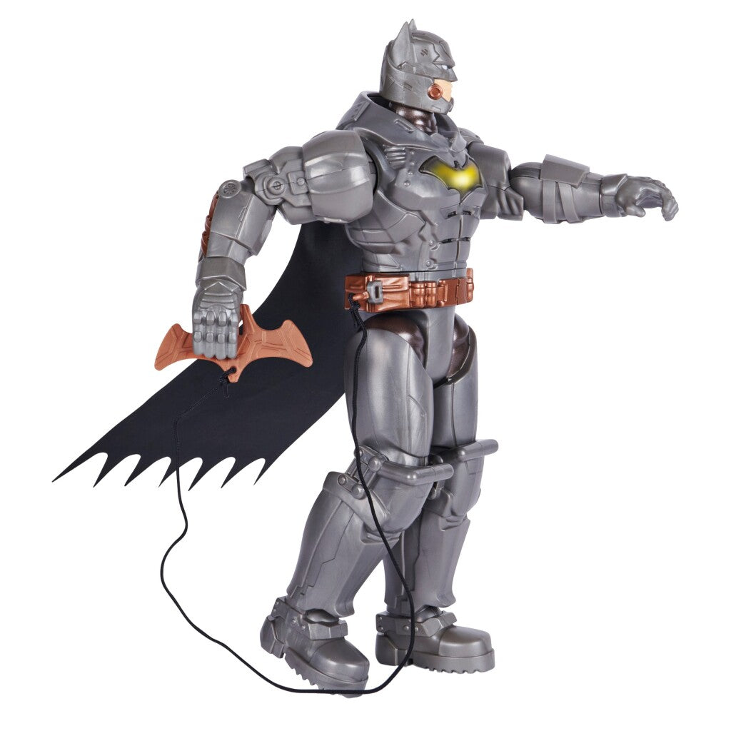 Creëer je eigen Batman-avonturen met de DC Comics Battle Strike Batman. Dit actiefiguur van 30 cm heeft een volledig pantser, gedetailleerde vormgeving, een comic-stijl en gadgetaccessoires om je favoriete Batman-personages tot leven te brengen. Rust je Batman uit met Batarangs, een net of een grijphaak. Wordt geleverd met 5 accessoires, die je Batman in zijn handen kunt blijven doen. Trek dan een been achteruit en gooi de gadgets naar superschurken. Batman kan ook een stoot uitdelen als hij niets in zijn hand heeft. Doordat je echt kunt gooien, kun je de misdaad bestrijden en Gotham City beschermen. Druk op de borst van Batman om meer dan 20 verschillende geluiden te activeren. Bereid je voor op epische actie met dit Battle Strike Batman-actiefiguur. Inhoud: 1 figuur, 5 accessoires. Wordt geleverd inclusief 3 knoopcel batterijen. Geschikt voor kinderen vanaf 3 jaar.