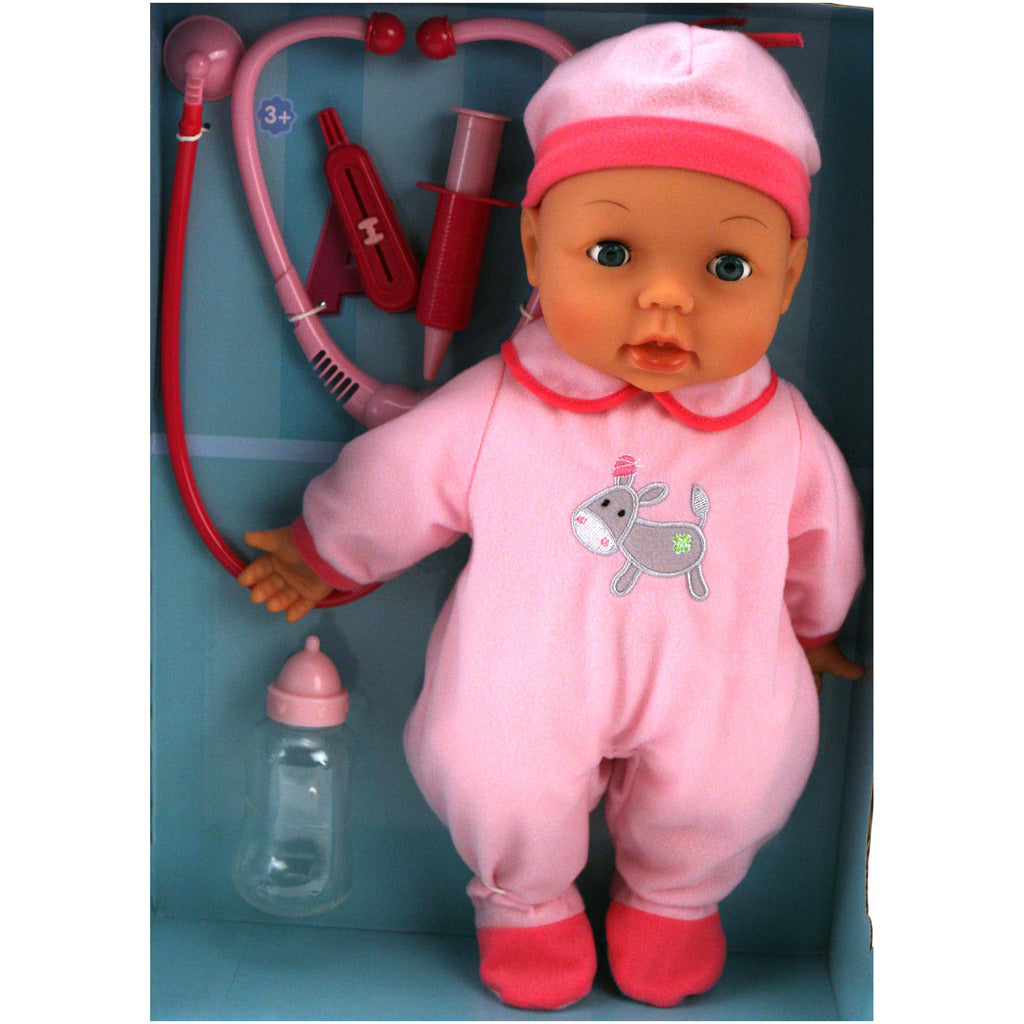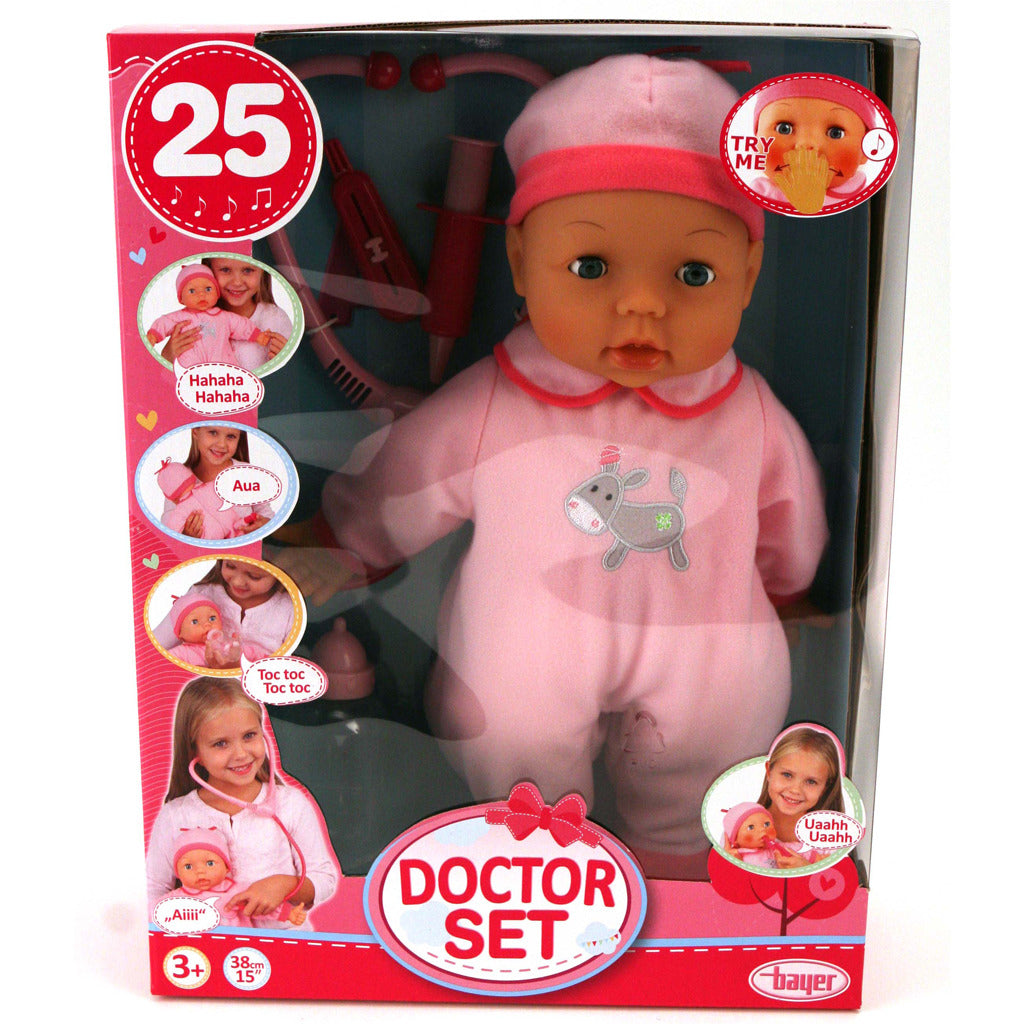 O nee! De pop is ziek! Ze laat het zelf merken.Maak haar snel beter door de doktersset te gebruiken! Zo, dat is beter. Nu lacht ze weer. De pop is 38 cm groot en maakt geluid.