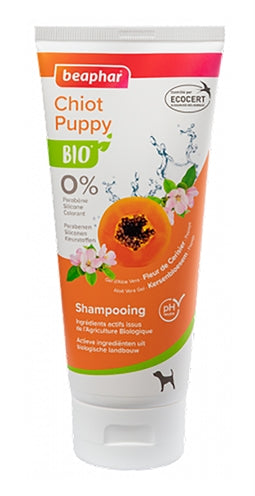 Beaphar Bio Shampoo Puppy 200 ml is een heerlijk geurende shampoo voor jonge honden, met Aloë Vera Gel voor een gehydrateerde en zachte huid en vacht. Het Ecocert label van deze shampoo garandeert de natuurlijke oorsprong van de gebruikte ingrediënten en de Aloë Vera is afkomstig uit biologische landbouw, een combinatie die zorgt dat deze shampoo niet alleen goed voor je pup, maar ook milieubewust is. De shampoo is verrijkt met kersenbloesem en papaja om de vacht te voeden en te beschermen. Door de neutrale pH-waarde van de shampoo wordt jouw pup heerlijk zacht en schoon zonder de huid of vacht te schaden.