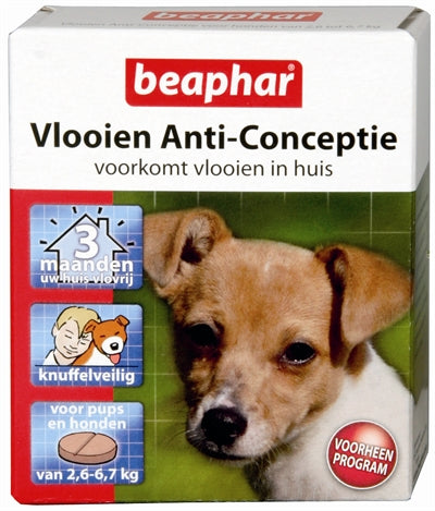 Beaphar Vlooien Anti-Conceptie Kleine Hond is een preventief vlooienmiddel voor de hond, dat zorgt dat vlooieneitjes en larven niet kunnen ontwikkelen. Het maandelijks behandelen van de hond met deze Vlooien Anti-Conceptie helpt vlooien in huis voorkomen en vermindert zo de kans op een vlooienplaag. Je kunt de tablet maandelijks door de voeding mengen of rechtstreeks in de bek geven. Indien er al vlooien aanwezig zijn, dient het dier ook behandeld te worden met een product dat volwassen vlooien doodt. Vlooien Anti-Conceptie is veilig te combineren met andere vlooienmiddelen te geschikt voor drachtige en zogende teven. Met Lufenuron als werkzame stof.