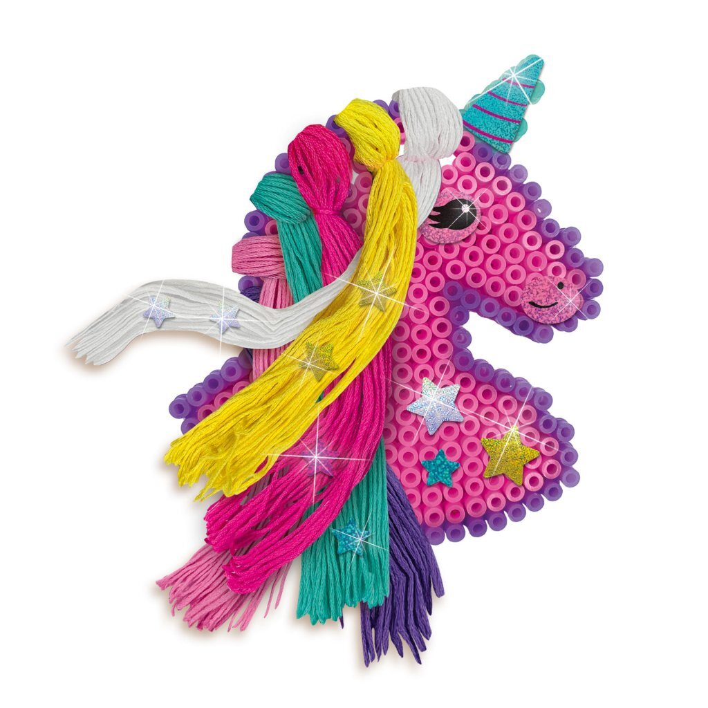 Maak je eigen unicorn van strijkkralen! Breng de eenhoorn tot leven door hem te versieren met manen van borduurgaren en mooie glitter stickers. Wauw, kijk de unicorn stralen!