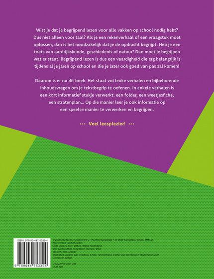 Daarom is er nu dit boek. Het staat vol leuke verhalen en bijbehorende inhoudsvragen om je tekstbegrip te oefenen. In enkele verhalen is een kort informatief stukje verwerkt: een krantenartikel, de spelregels van een spel... Op die manier leer je ook gewone informatie op een speelse manier te verwerken en begrijpen.