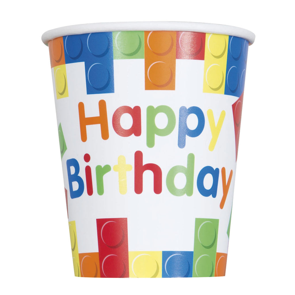 Fijne verjaardag... met de Bekers Bouwblokjes! Deze kartonnen bekers zijn voorzien van een vrolijke, gekleurde afbeelding van LEGO steentjes en de tekst: Happy Birthday.