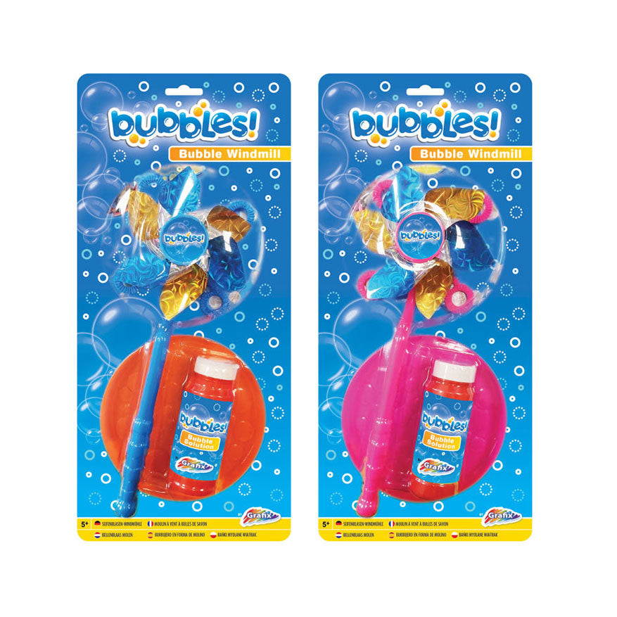 Windmolentje met bellenblaas. Inclusief bellenblaasbakje en 100ml bellenblaas. Geschikt vanaf 5 jaar.
