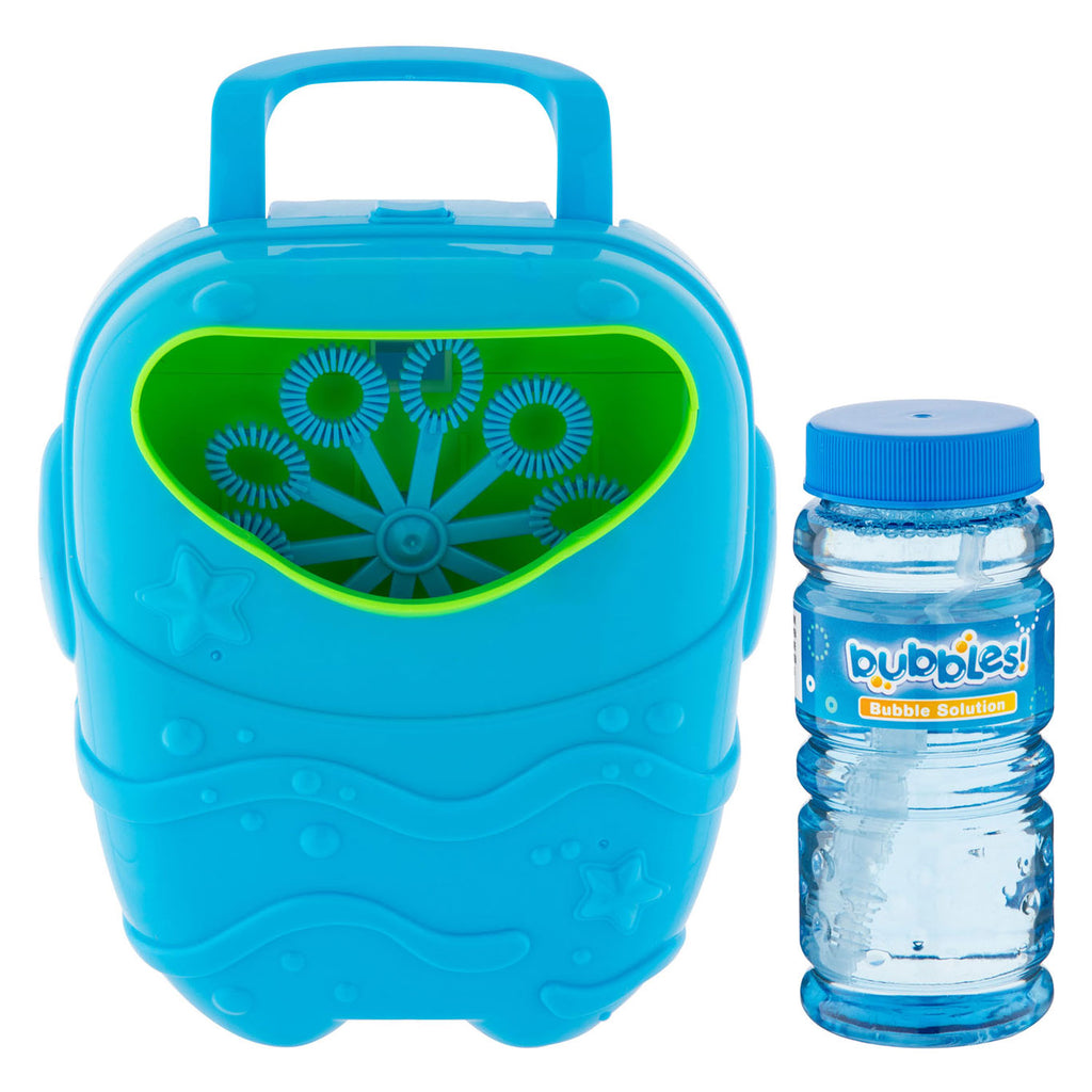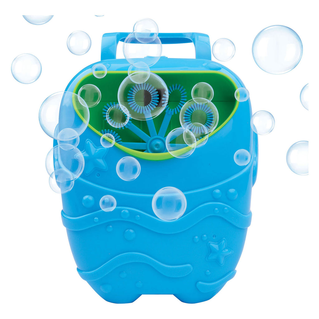 Blauwe bellenblaasmachine inclusief fles bellenblaas. De bellenblaasmachine heeft een handig draaghandvat en werkt op batterijen (3x AA, niet inbegrepen). Geschikt voor kinderen vanaf 5 jaar oud.