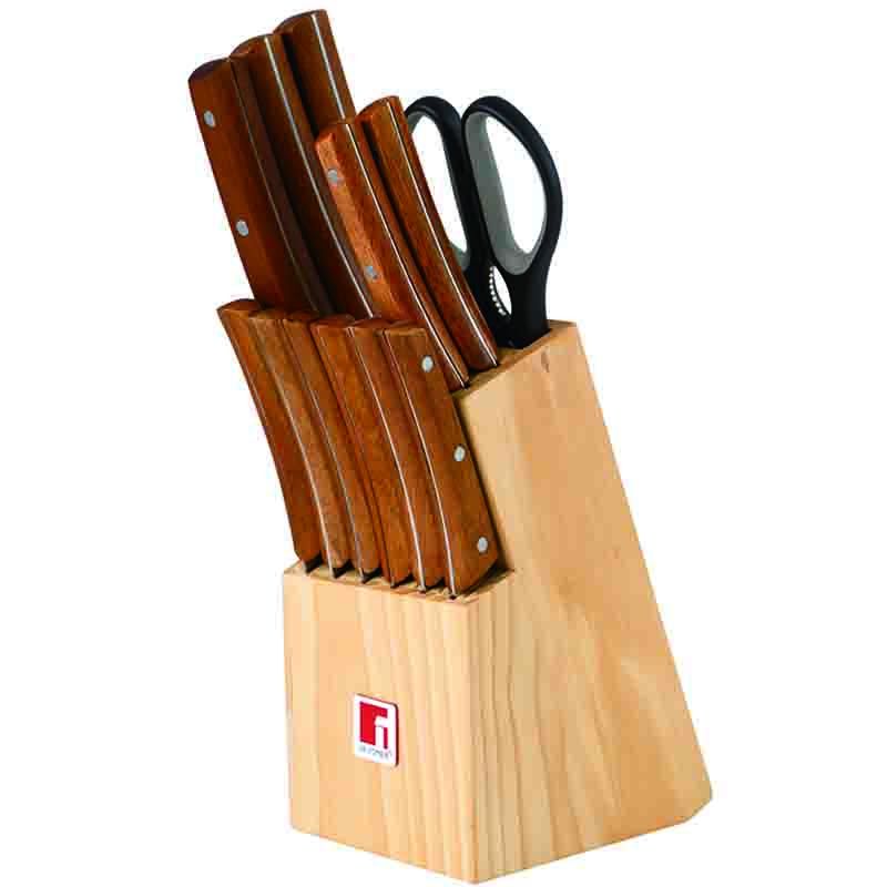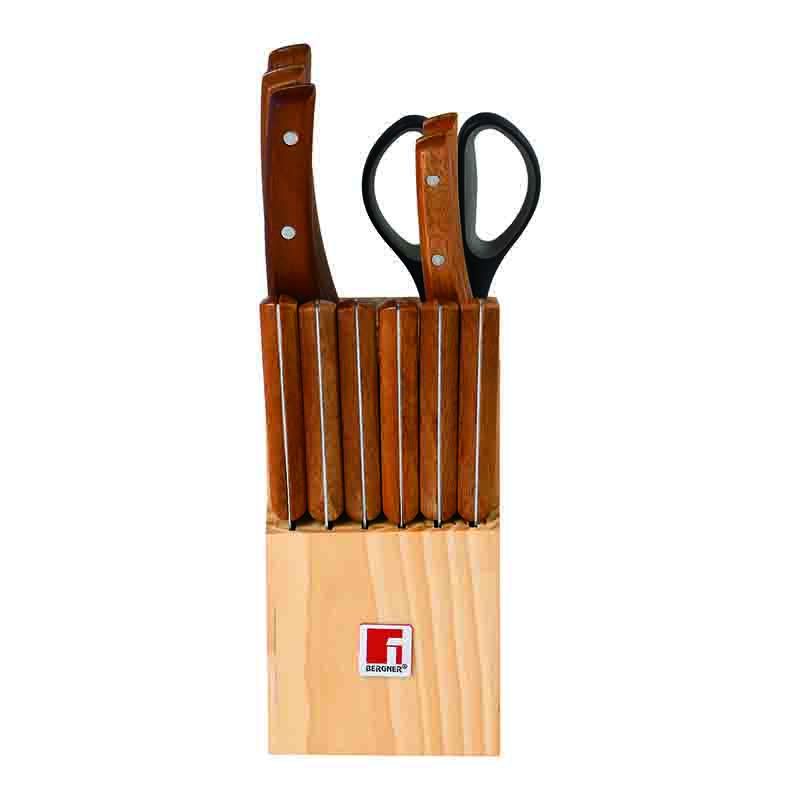 Roestvrijstalen messen met een houten heft uit de serielijn "Natural" van het kwaliteitsmerk Bergner. De 11 messen en keukenschaar kun je handig opbergen in het houten messenblok.