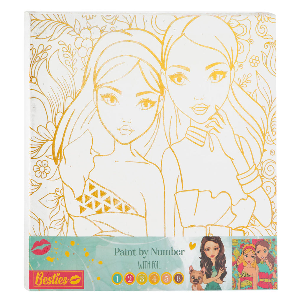 Besties schilderen op nummer set. Het canvas is 30x30 cm groot, heeft lijnen in goudfolie, 6 kleuren verf en een penseel. Geschikt vanaf 4 jaar.