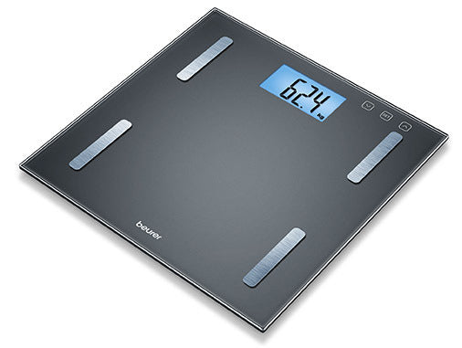 De Beurer Diagnoseweegschaal BF 180 geeft nauwkeurige gegevens over je lichaamsgewicht, lichaamsvet, lichaamsvocht, spiermassa, botmassa en caloriebehoefte (BMR) en berekent de BMI voor een eenvoudige indeling van het lichaamsgewicht. De weegschaal heeft een extra groot lcd-display met blauwe achtergrondverlichting. Het beschikt over vijf activiteitenniveaus en geheugen voor 10 gebruikers. Het maximale gebruikersgewicht is 180 kg