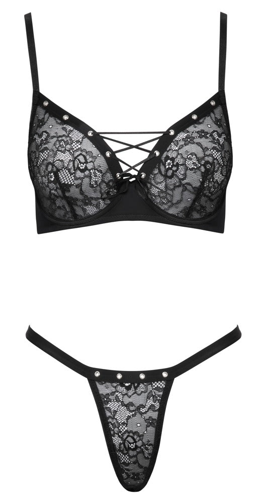 Beugelbeha en string in een zwart setje van Cottelli LINGERIE. Cups en string voorkant van zacht, rekbaar kant met decoratieve zilverkleurige oogjes. Kleine decoratieve vetersluiting tussen de beugelcups. Verstelbare haaksluiting op de rug. De bandjes zijn ook verstelbaar voor een perfecte pasvorm. Rio string met comfortabele stretch tailleband.