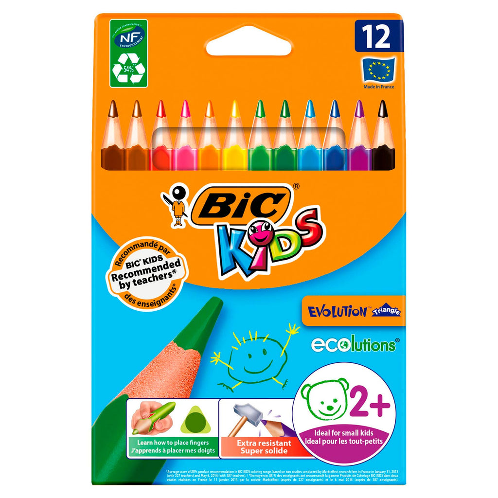 Etui met 12 driehoekige BIC kleurpotloden, zonder hout in kunsthars. Door de harslaag is het potlood zeer schokbestendig. Het potlood is veilig: geen splinters bij breken en bijtbestendig. Het potlood is door zijn driehoekige vorm ideaal voor kleine kinderen.