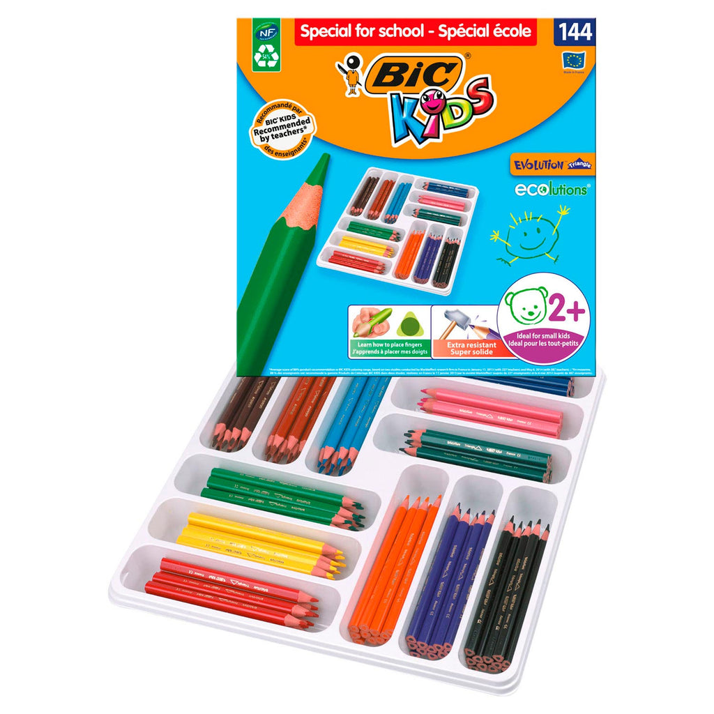 144 driehoekige BIC kleurpotloden, zonder hout in kunsthars. Door de harslaag is het potlood zeer schokbestendig. Het potlood is veilig: geen splinters bij breken en bijtbestendig. Het potlood is door zijn driehoekige vorm ideaal voor kleine kinderen.