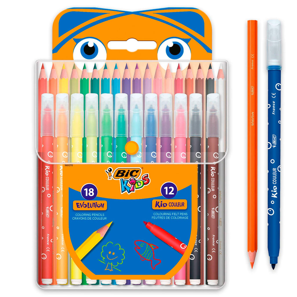 Met deze kleurpotloden en stiften set in een handige plastic hoesje is je kind uren zoet! Met de stiften en kleurpotloden kunnen tekeningen prachtig ingekleurd worden. Deze kun je ophangen in je eigen kamer of per post naar opa en oma of een vriendje sturen. In de set zitten 18 Bic Kids Evolution kleurpotloden en 12 Bic Kids Kid Couleur stiften in verschillende kleuren.