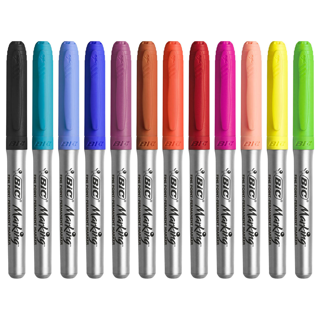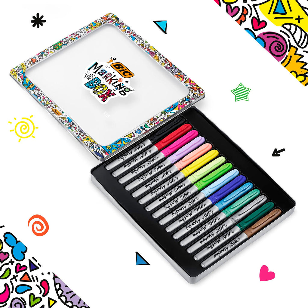 In dit metalen doosje met printopdruk zitten 15 verschillend gekleurde BIC markeerstiften. De stiften hebben een mediumpunt van 1,8 millimeter en een lijnbreedte van 0,8 millimeter. De markeerstiften zijn geschikt voor verschillende ondergronden zoals papier, metaal, foto's en glas. De markeerstiften zijn sneldrogend.