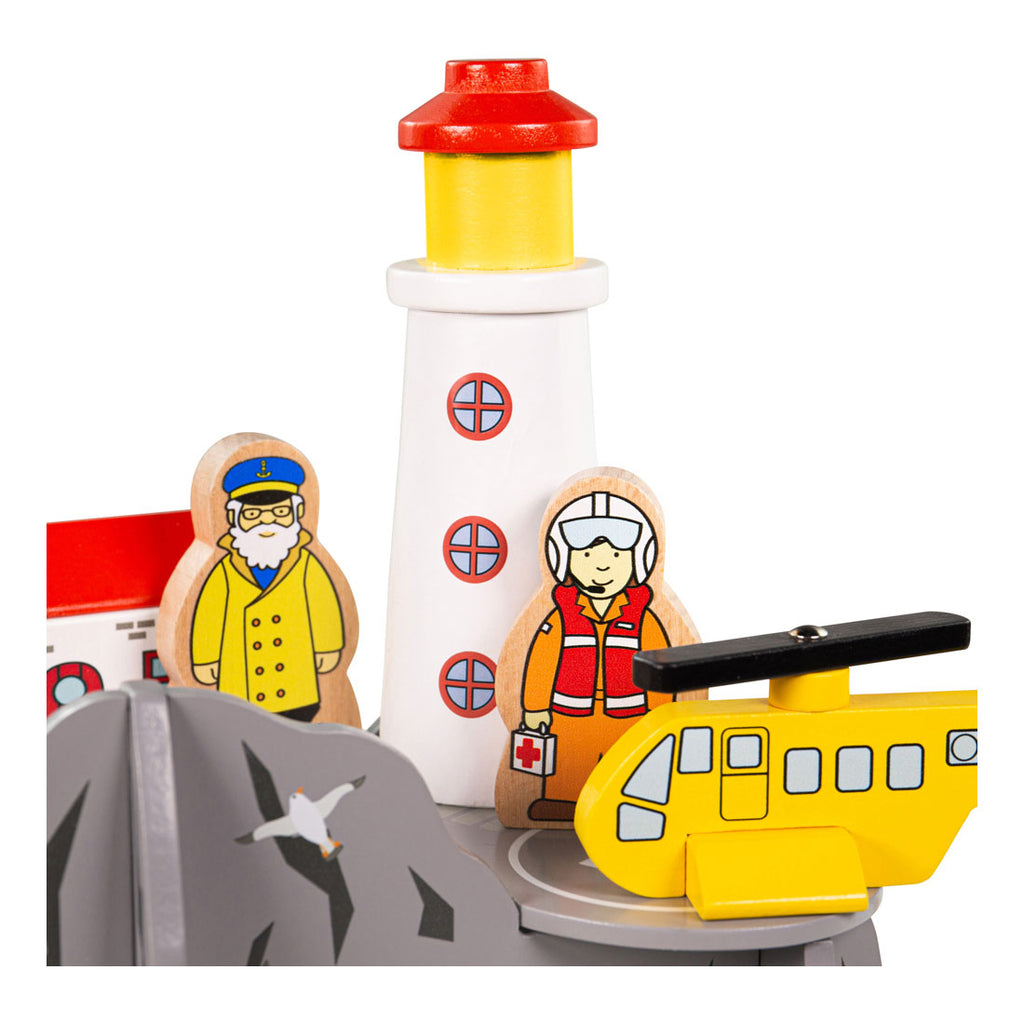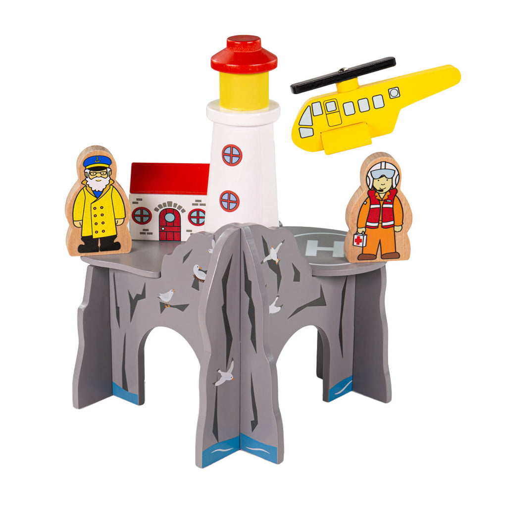 - 4-weg treintunnel met vuurtoren, huisje, vuurtorenwachter, reddingshelikopter en piloot.