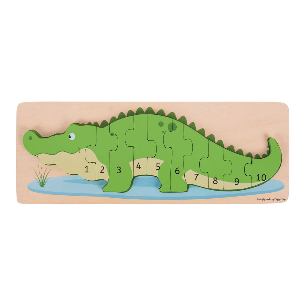 Houten krokodil puzzel om te leren tellen en rekenen. Gemaakt van hoogwaardige, verantwoorde materialen. Voldoet aan de huidige Europese veiligheidsnormen. 10 puzzelstukjes.