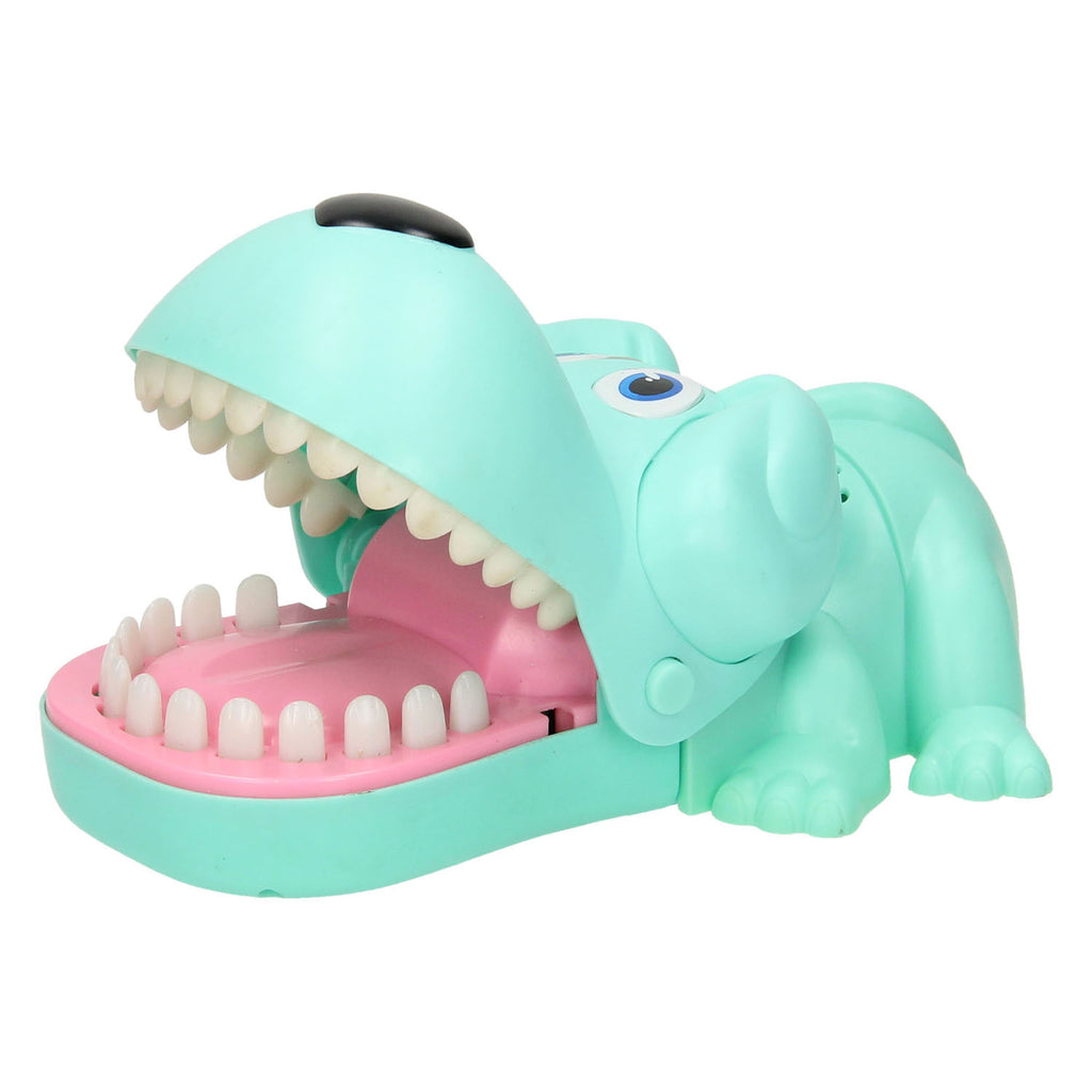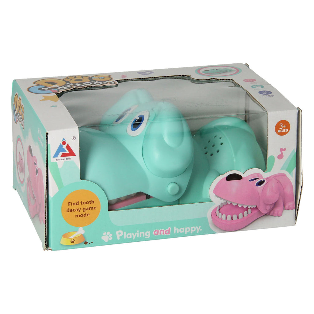 Pas op voor de bijtende hond! Druk om de beurt één van de tanden van dit pastelblauwe hondje in. Zorg dat jij niet gebeten wordt! Met geluid. Geschikt vanaf 3 jaar.