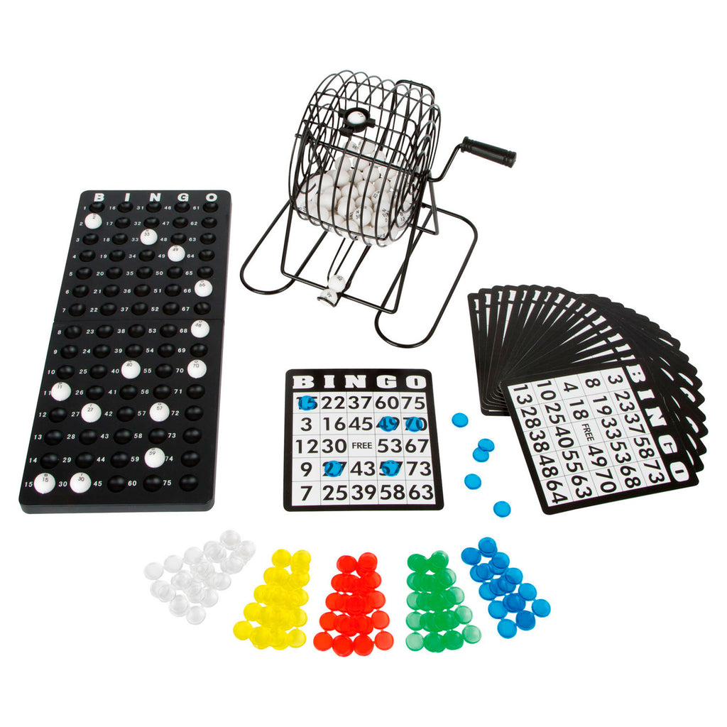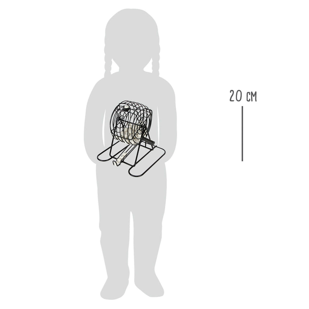 Bingo is al jarenlang een favoriet gezelschapsspel voor een kinderfeestje of ander festijn! De set bestaat uit een zwart metalen draaimolen, witte bingo balletjes, een zwart kunststof bingo bord en een aantal zwarte bingo kaarten. De fiches hebben vijf verschillende kleurtjes. De bingo molen is 20 centimeter hoog.
