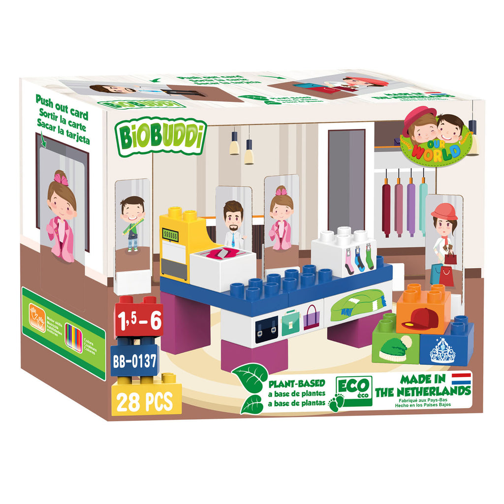 Bouw je eigen Fashion store, verkoop de mooiste kleren van de stad en wie weet lopen ze binnenkort met jouw kleren over de Catwalk. De leerzame en leuke speelset Fashion Winkel bevat 28 bouwblokken, 5 uitdrukkaartjes met nieuwe personages, zoals de getalenteerde stylist en zijn klanten, en een gloednieuw achtergrond. Alle kaartjes zijn verwerkt in de 100% recyclebare verpakking! Onze bouwblokken zijn speciaal gemaakt door kinderen van 1.5 tot 6 jaar, gemaakt van resten uit de suikerriet plant. De blokken zijn milieuvriendelijk, recyclebaar, duurzaam en ook uitwisselbaar met andere merken. Het helpt kinderen met het ontwikkelen van zowel motorische, cognitieve en creatieve vaardigheden tijdens het spelen. Met BiOBUDDi laat je zien dat je verantwoord omgaat met de planeet en toekomst van de aarde. Daarnaast staat BiOBUDDi garant voor uren veilig en verantwoord speelplezier.