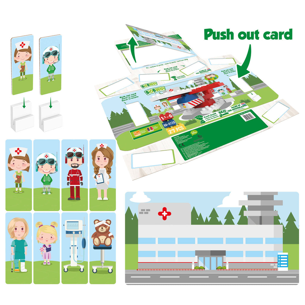 Bestuur je eigen Rescue helicopter! Vlieg hoog in de lucht, ontwijk bomen, vlieg net boven de waterlaag. Laat met de RESCUE helicopter je vlieg talenten zien! “Burgemeester! Help, ik zit vast in de bergen!” Bouw snel de RESCUE helicopter, vlieg hoog in de bergen en ga opzoek naar de bange burger, kan jij hem vinden? De speelset Rescue bestaat uit 40 verschillende onderdelen, gemaakt van resten uit de suikerriet plant.De blokken zijn milieuvriendelijk, recyclebaar, duurzaam en ook uitwisselbaar met andere merken. De verpakking is zo ontworpen dat het onderdeel uit maakt van het product. Het is gemaakt van FSC karton en met een simpele ‘push’ kan je gemakkelijk verschillende kaartjes eruit halen en zetten in de bijgevoegde kaarthouders voor nog meer speel plezier. BiOBUDDi is gemaakt voor kinderen tussen de 1,5 en 6 jaar, Het helpt kinderen met het ontwikkelen van zowel motorische, cognitieve en creatieve vaardigheden tijdens het spelen en bouwen met BiOBUDDi.