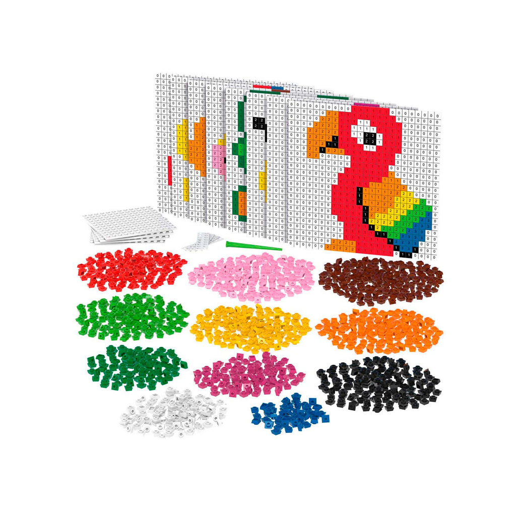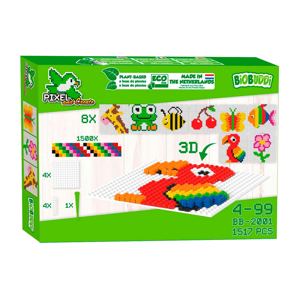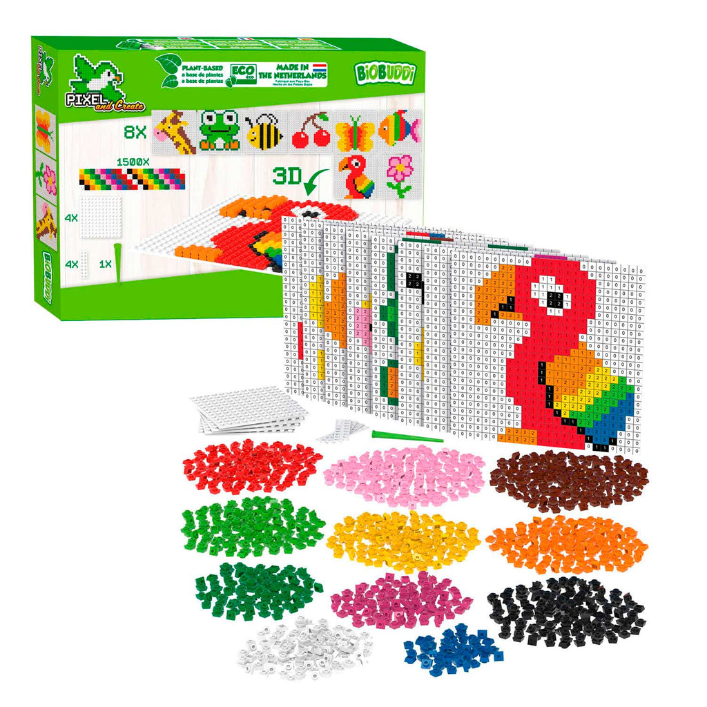 BiOBUDDi Pixel and create starterset. De set bestaat uit 1500 milieuvriendelijke pixel blokjes in de kleuren wit, zwart, geel, oranje, lichtgroen, donkergroen, bruin, roze, paars en rood, een remover, acht verschillende voorbeeld kaarten, vier bouwplaten en vier koppelstukjes.