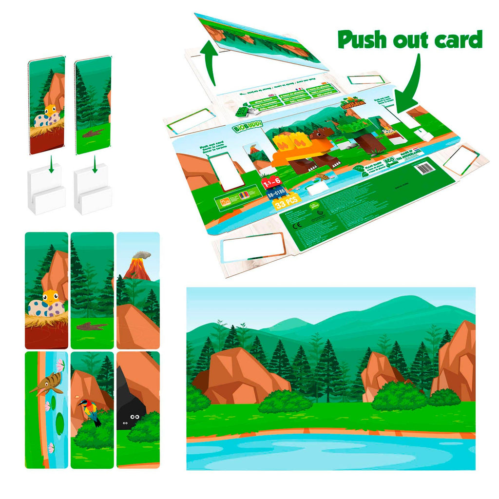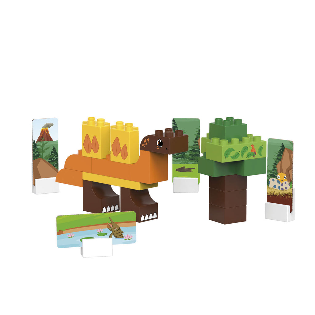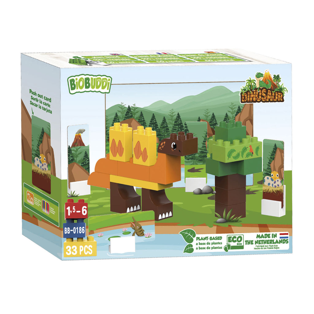 De Stegosaurus bouwset van BiOBUDDi bestaat uit 20 bouwblokken, zes sleufblokken en zeven uitdrukkaarten.Alle bouwblokken van BiOBUDDi zijn gemaakt van de niet bruikbare resten van de suikerriet plant, dit maakt het een ecologisch product.
