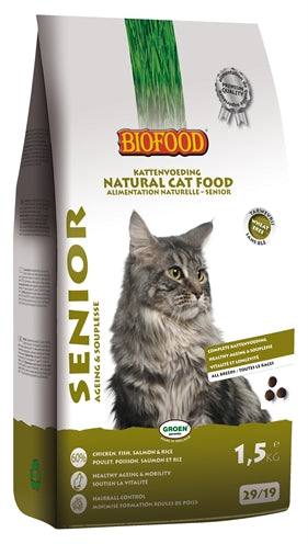 BF Petfood® Senior. Hoogwaardige, volledige, natuurlijke kattenvoeding die ontwikkeld is voor oudere katten en katten met gevoelige nieren. Zeer smaakvolle voeding met o.a. kip, zalm, zalmolie, chondroïtine en glucosamine. Hoge acceptatie, licht verteerbaar en een graanvrij recept. Zeer geschikt voor kieskeurige katten of moeilijke eters. Gereduceerd fosfor- en natriumgehalte. Ondersteunt de veroudering, vertering, nieren, gewrichten en huid en vacht. Voor oudere katten en volwassen katten met gevoelige nieren.
