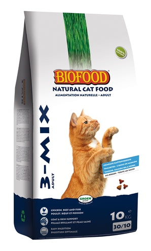 Biofood kat 3-mix kattenvoeding is met grote zorg bereid met natuurlijk geselecteerde ingrediënten. BIOFOOD kat 3-mix bevat de optimale dagelijkse hoeveelheid eiwitten, vetten, koolhydraten, vitaminen en mineralen die bijdragen tot een goede gezondheid van uw kat. De bronnen van eiwitten, koolhydraten en vetten zijn van hoge kwaliteit. Deze zorgen voor een betere vertering en ontlasting. Het hoge vleesaandeel zorgt voor een perfecte opname en prima acceptatie. Het gehalte aan minerale grondstoffen is laag, waardoor de zuurgraad in de urine eveneens laag blijft, wat zorgt voor een goede blaasfunctie. Daarnaast is BIOFOOD kat 3-mix voeding verrijkt met taurine en gezonde omega 3 en 6 vetzuren. BIOFOOD kat 3-mix kattenvoeding is een natuurlijke, smaakvolle, gezonde en complete voeding voor uw kat.