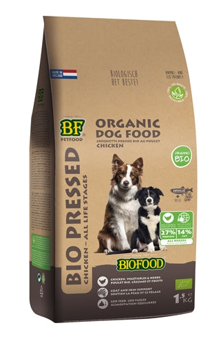 Biofood Organic Geperst hondenvoer 1,5 kg is een hoogwaardig volledig, koudgeperst droogvoer voor de hond, graanvrij, 100% natuurlijk en bereid met biologisch vlees en biologische groente. Voor een gezonde hond én een beter dierenwelzijn en milieu! De Organic geperste brokken zijn bereid met 100% natuurlijk ingrediënten, uit biologisch vlees en biologische groente. Niet alleen zijn deze ingrediënten geproduceerd zonder bestrijdingsmiddelen, ook is er in de biologische veeteelt veel aandacht voor het dierenwelzijn en het milieu. Zo geniet jouw hond dus niet alleen van gezonder voer, maar werk je ook mee aan een beter leven voor andere dieren! Bovendien is dit voer door het gebruik van enkel natuurlijke, biologische ingrediënten erg smakelijk én gezond voor jouw hond. Het voer is samengesteld zonder kunstmatige toevoegingen en koud geperst, waardoor de voedingsstoffen en smaak beter bewaard blijven. Ook bevat het voer geen graan of tarwe, maar natuurlijke toevoegingen als kruiden en zalmolie. Hierdoor zorgt het voor een goede verteerbaarheid en hond met gezonde huid en vacht.