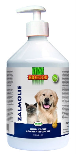 BF Petfood Zalmolie in 500 ml is een smakelijk, aanvullend supplement voor de hond en kat vol van omega 3 en 6 vetzuren, ideaal voor een gezonde vacht en huid. Deze vloeibare smaakmaker is koudgeperst gemaakt uit Pacifische zalm en zeer rijk aan onverzadigde vetzuren. Hierdoor is de zalmolie gunstig voor hart en bloedvaten, gewrichten, vertering en in het bijzonder de huid. De zalmolie heeft een uitermate positief effect op honden met huid- en vachtproblemen en kan een anti-infammatoire werking hebben.